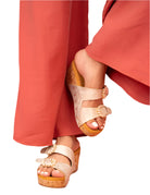 Decorative stud accents enhance the look. Pearl-style embellishments give a unique flair, perfect for picnics and casual outings. The cork sole is durable and absorbs shock. Each step feels smooth and relaxed. These stylish wedge sandals with straps support all foot shapes.