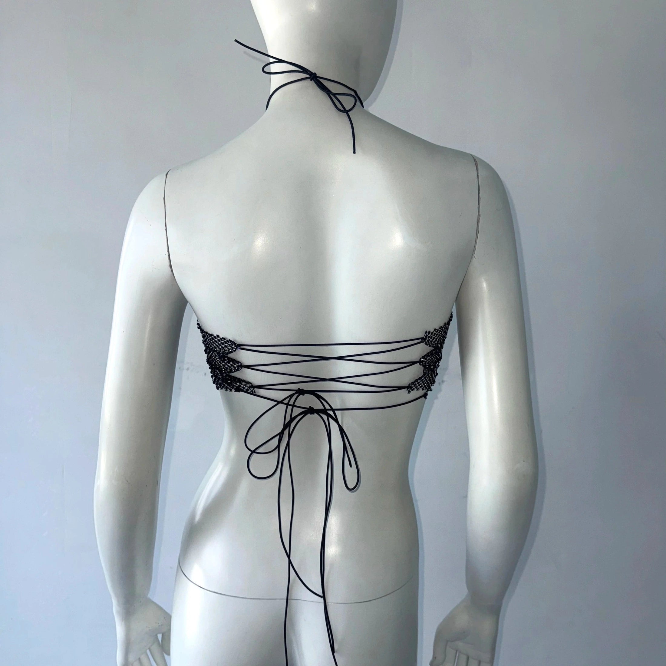 Adjust the halter neck for your perfect fit. The mesh fabric stretches to move with you. The bandage ties highlight your back. The rhinestones shimmer through every photo and moment. Showcase your confident style by making this backless bandage clubwear tank your top pick for this season.