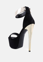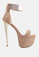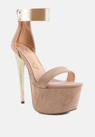 Sky High Bling Heel Sandals in microfiber with metallic detail band on the ankle - these statement sandals come with back zipper opening and look gorgeous on feet.
