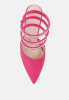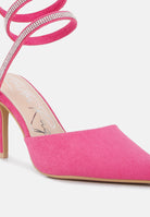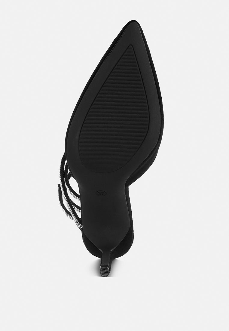 Are you looking for a pair of playful and sophisticated heels? These heels come with rhinestones embellished strap up detail that glamourously snakes around your legs. Its feminine, its statement fashion and it's all things every unapologetic fabulous woman looks for! Pair it with your most stunning evening dresses or with your most romantic date outfits and make sure that no one is able to take their eyes off you!