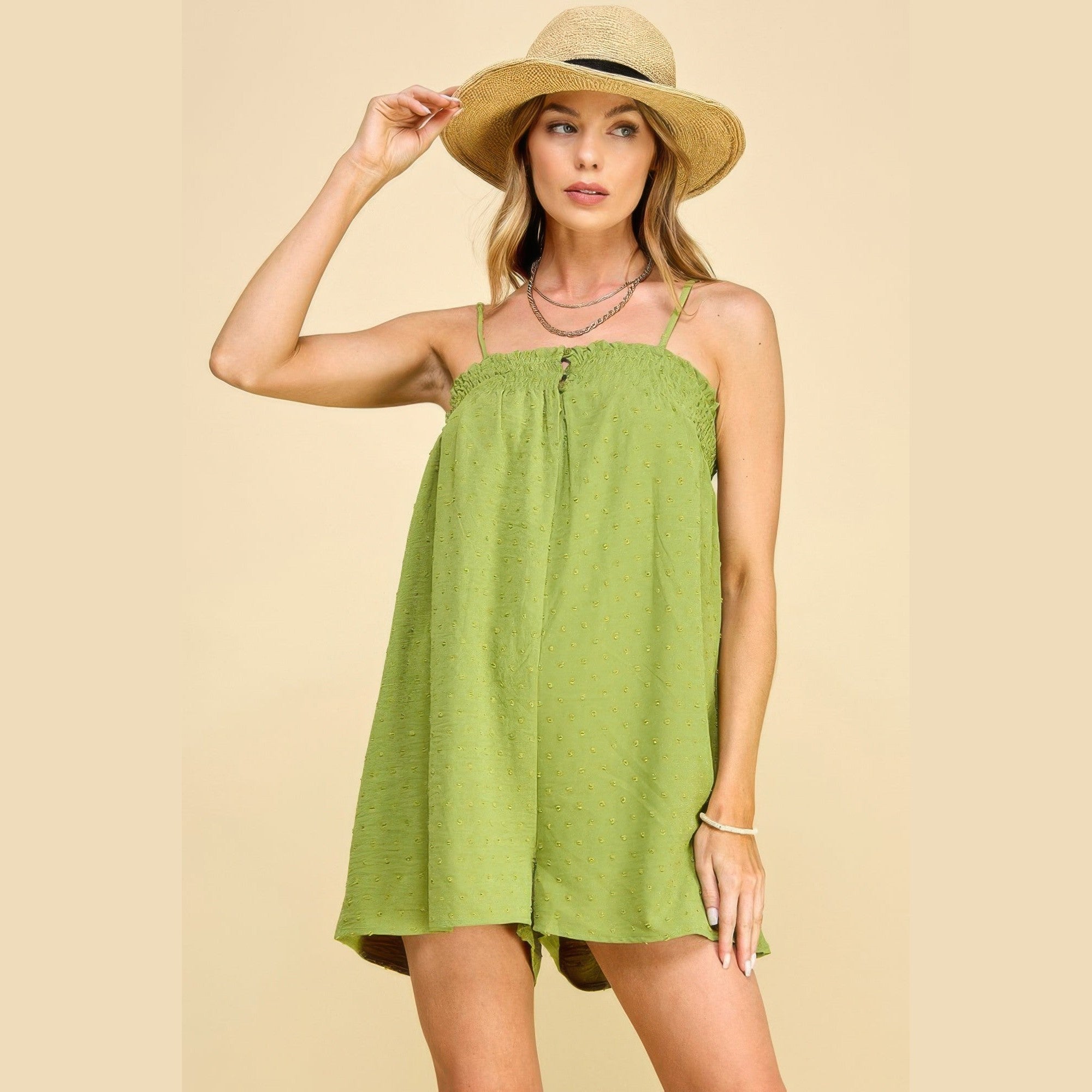 Add the Swiss Dot Woven Romper in Happy Olive to your collection today and enjoy the perfect blend of comfort, style, and versatility!