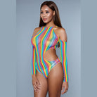 VacationGrabs brings you the 1997 Strange Love Bodysuit made by BE WICKED. This rainbow cutout bodysuit stands out with its bold stripes. Vibrant rainbow colors catch attention in any setting. The design is playful and daring. Each color shines in the lightweight material so you can move freely.