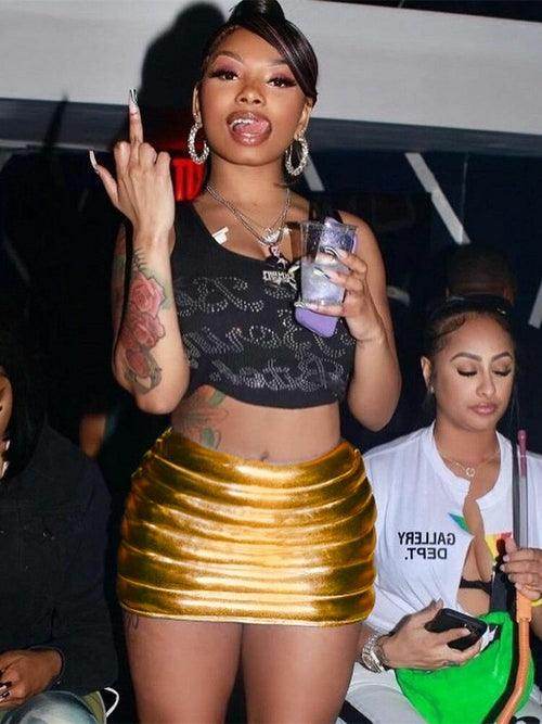 Elevate your vacation wardrobe with the Gold Puffer Mini Skirt, a stunning creation by Red Iphigenia, available at VacationGrabs. This quilted warm mini skirt combines style and comfort, making it perfect for chilly nights out. The metallic shine of the fabric adds a touch of glamour, ensuring you stand out in any setting.