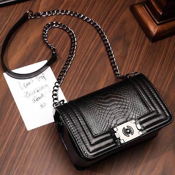 Structured top-handle shoulder bag with python texture. Fun, modern chain detail on flap. Unique closure in gunmetal. Removable strap with chain and leather. Carry it as a shoulder bag or extend the strap and carry it as a crossbody.