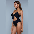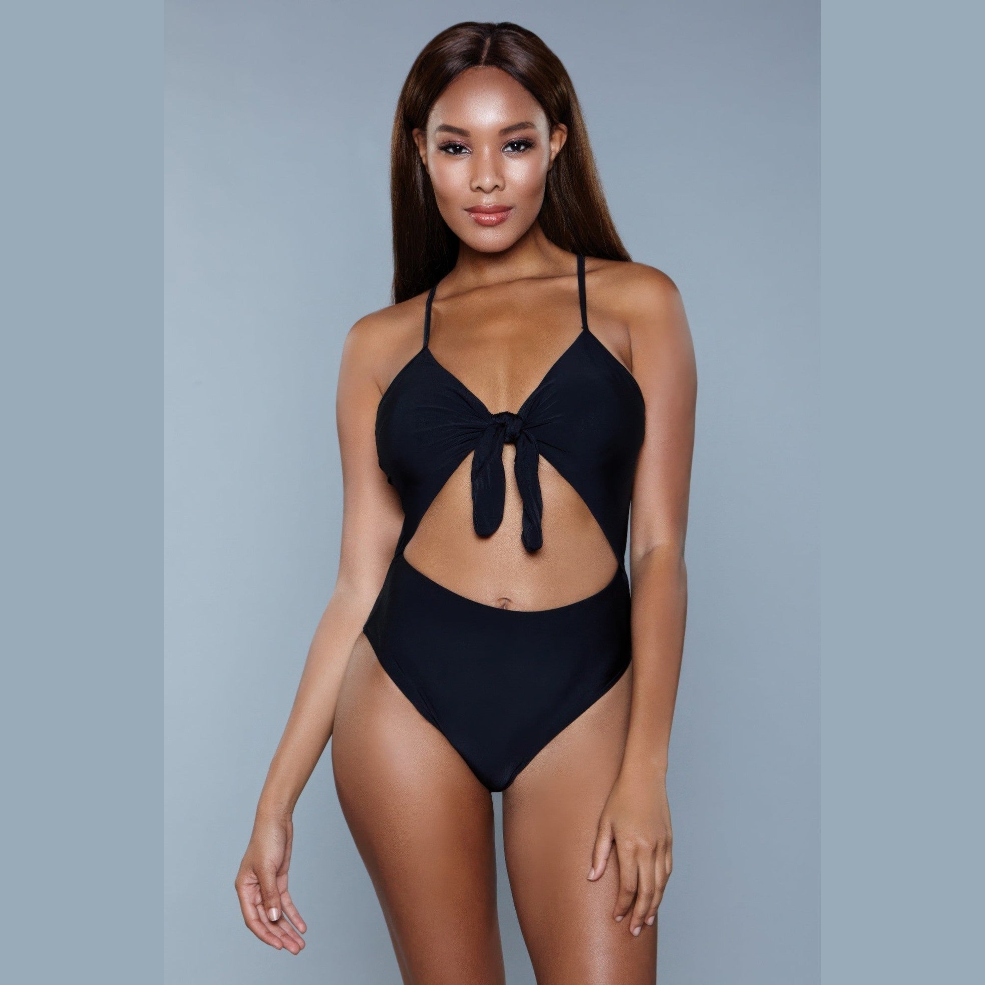 Elegant and striking, the Delaney Swimsuit is designed to make a confident statement. Featuring a bold front cut-out and a playful tie-front bow, this piece blends refined sophistication with figure-flattering style. The sweetheart neckline enhances the silhouette, while padded cups and adjustable shoulder straps provide support and customizable comfort. Crafted from a smooth blend of polyester and spandex, the fabric offers a sleek feel with the perfect amount of stretch. Whether lounging poolside or heading to the beach, this suit offers a flattering fit with just the right amount of allure.