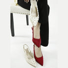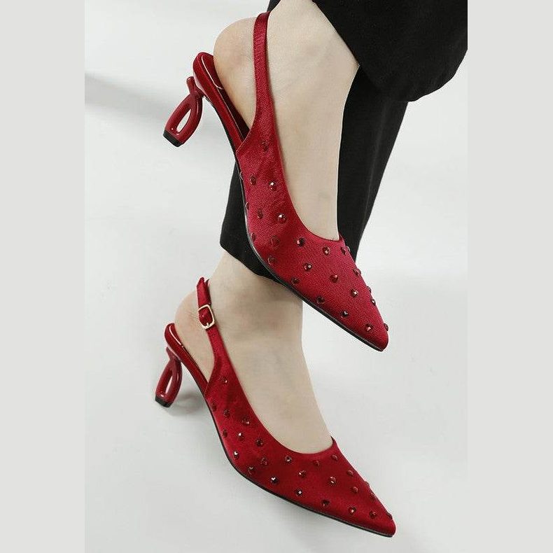 These gorgeous satin slingbacks are anything but basic-they stand out with a pointed toe and adjustable pin buckle slingback straps. Adorable heart-shaped embellishments and exquisite fantasy heels make them essential to your party wear, date night looks, or brunches.