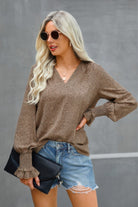 Elevate your wardrobe with our dot v neck ruffle blouse. This stylish piece features a loose fit that drapes beautifully on the body. The ruffle long sleeves add a feminine touch, making it perfect for both casual outings and special events.