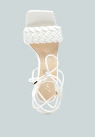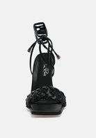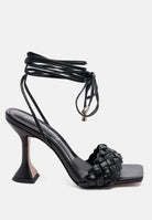 Elevate your shoe collection with these spool heel faux leather sandals featuring a tie-up fastening and an open square toe design. These trendy and chic sandals are a fashionable choice for any occasion, providing both style and comfort.