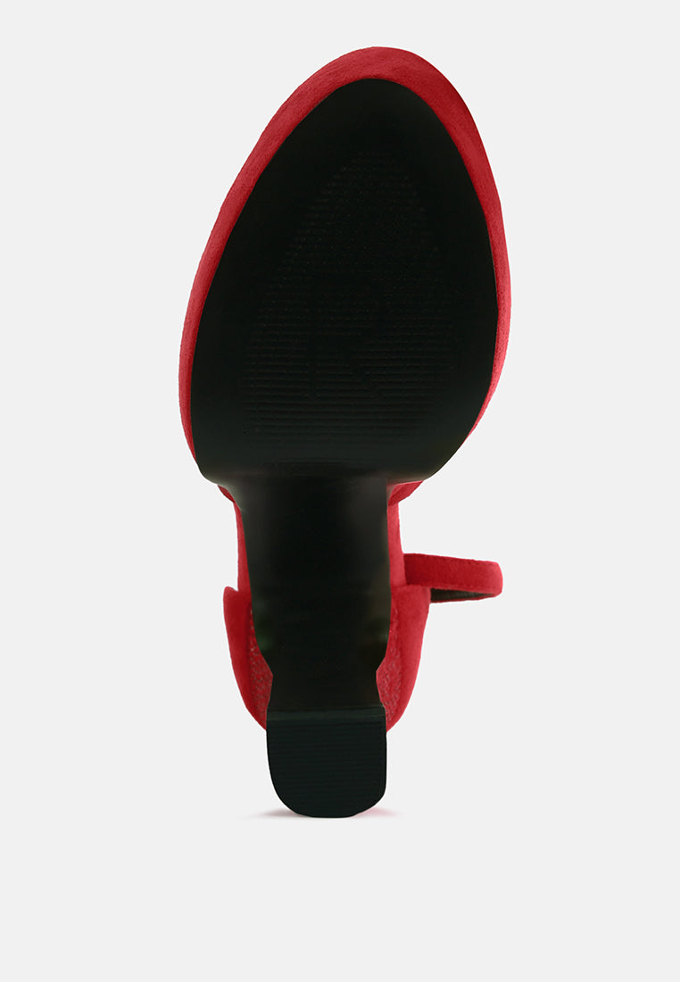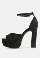Block heeled handcrafted sandals in fine micro suede comes with elegant diamante studs heat set on the high block heel. The sandal has lifghtly padded insole which cuts strain. The peep toe sandal has thin ankle strap pin buckle fastening which makes the feet settle well.