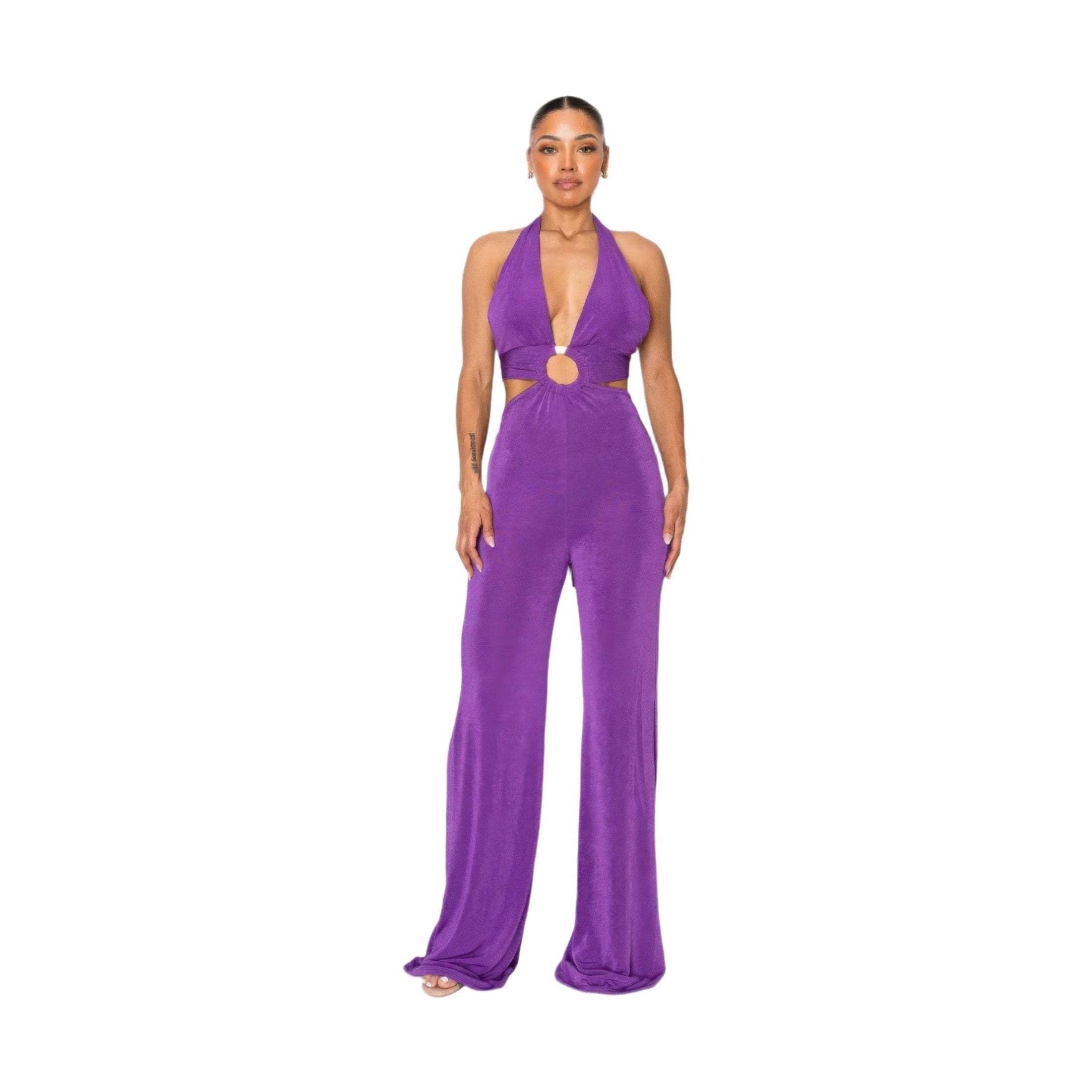 Make a stylish statement with our Solid Slinky Wide Legs Jumpsuit in vibrant purple. This elegant jumpsuit features a sleek wide-leg silhouette and a modern o-ring detail, perfect for adding a touch of sophistication to your wardrobe.