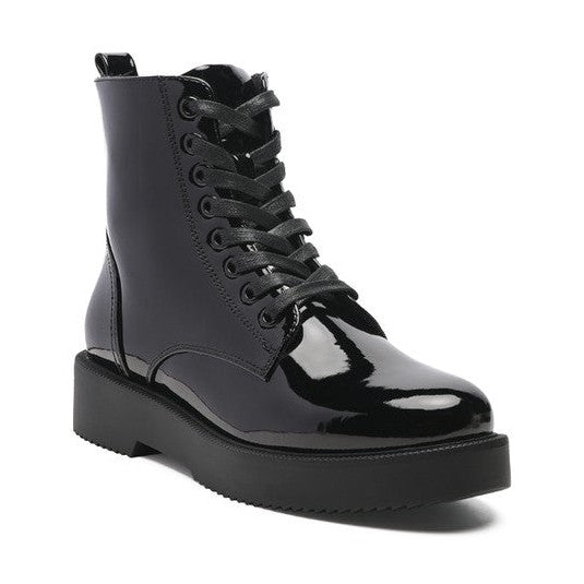 Step out in style with the Rubble Statement Pu Lace Up Ankle Boots. These stunning black statement combat boots are designed for the modern woman who values both fashion and comfort. Made with a sleek polyurethane upper, these ankle boots provide a shiny finish that catches the eye.