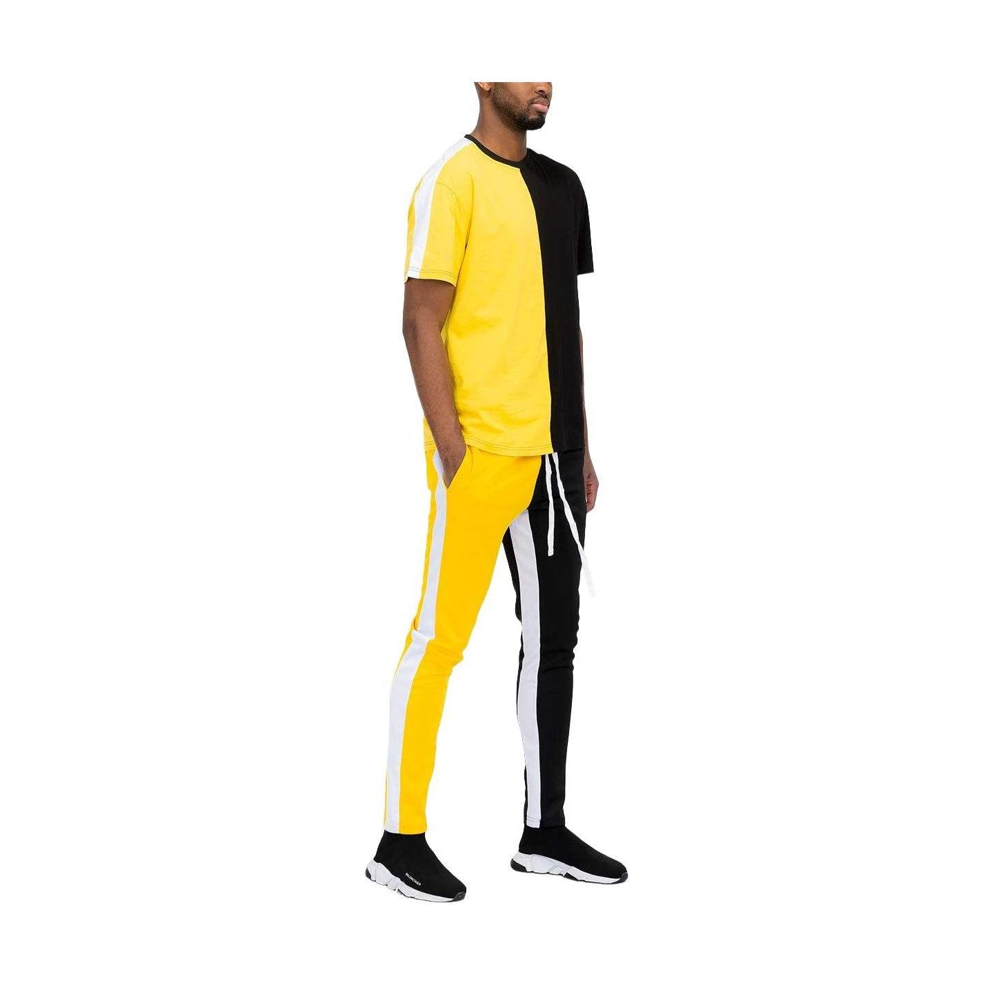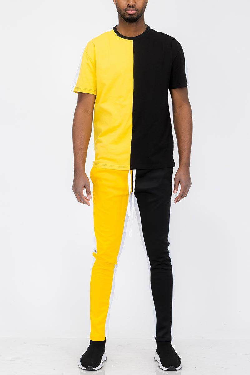 Elevate your style with the Men's Yellow Black Two Way Split Tshirt Pants Set from VacationGrabs. This vacation mens clothing set perfectly blends vibrant yellow with classic black, offering a bold look for any casual outing.