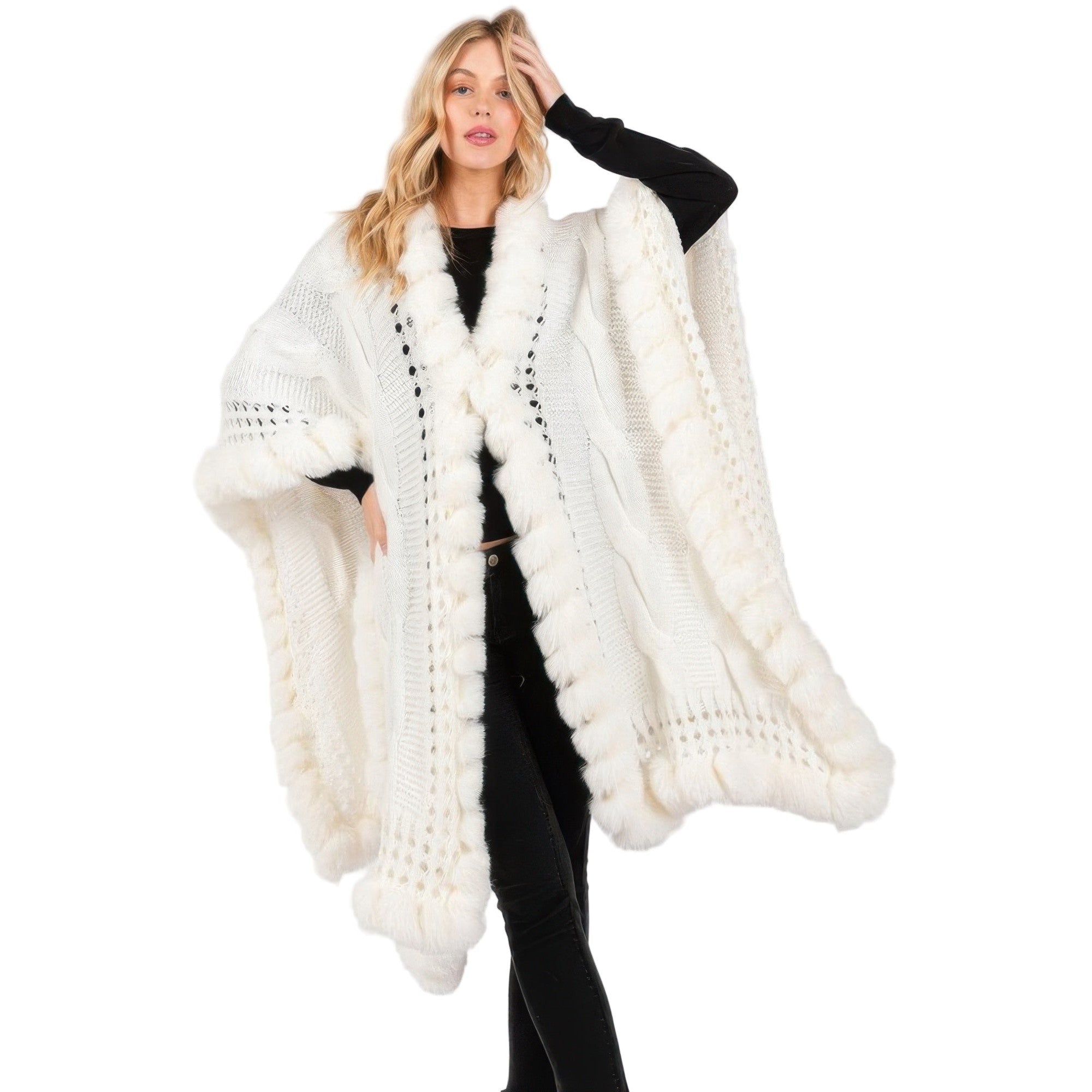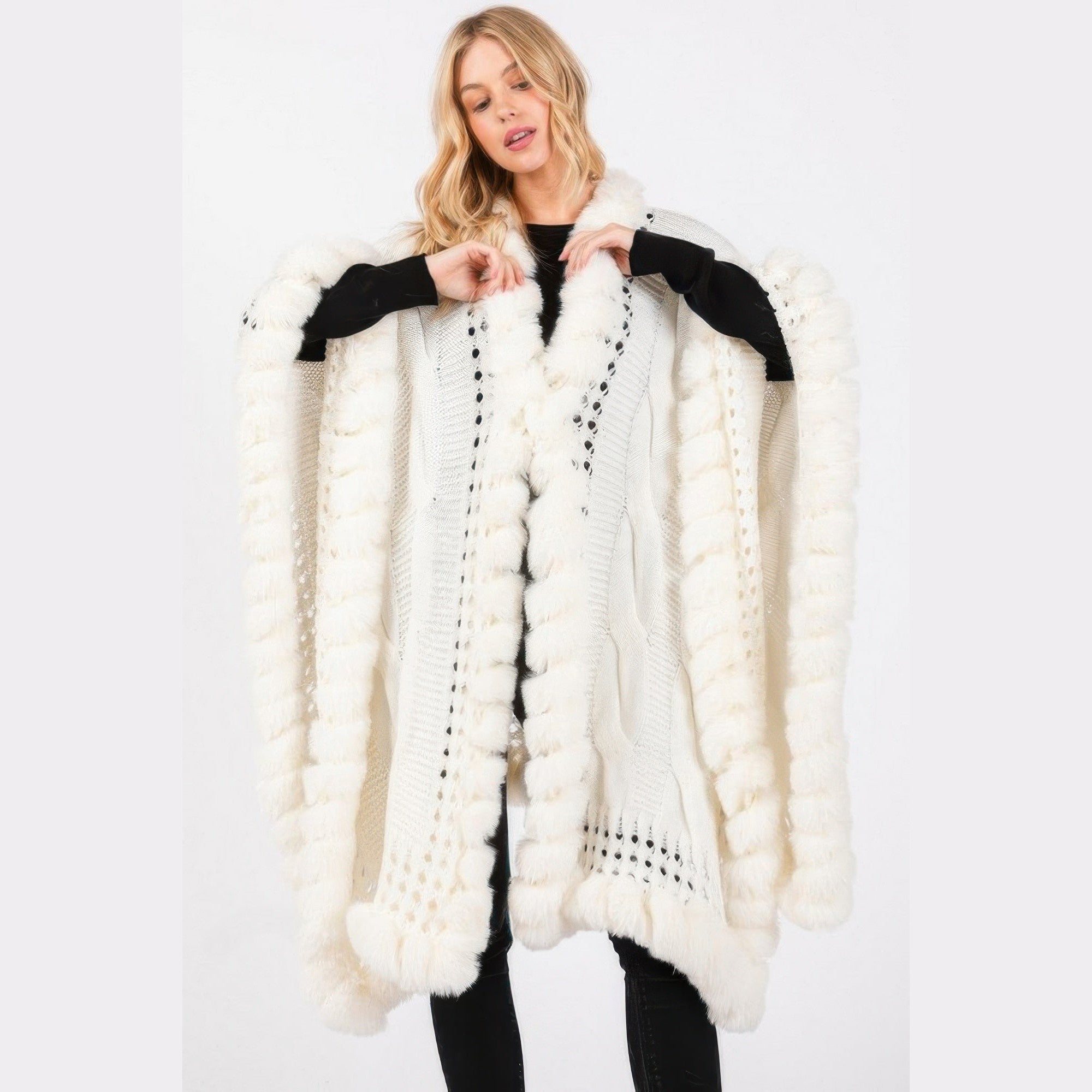 VacationGrabs Black Plush faux fur trim cape for women