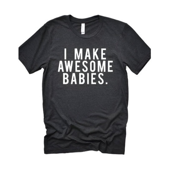 The Awesome Babies Tee from VacationGrabs is a perfect pick for any proud dad. This classic funny dad t-shirt offers a relaxed fit that feels soft. It features bold white lettering on a deep black background. The statement "I MAKE AWESOME BABIES" stands out and is sure to turn heads.