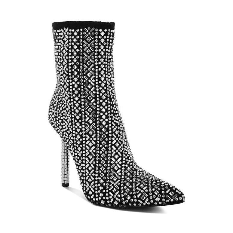 Elevate your shoe collection with these show-stopping ankle boots. Available in a classic black, they allow for easy pairing with various outfits. The gemstone embellishment ensures that these boots will never go unnoticed. Grab your pair today and upgrade your fashion game instantly.