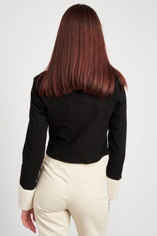 The black and white cuff jacket stands out with its cropped design, highlighting a flattering silhouette. The contrasted collar adds a touch of sophistication, perfect for both casual outings and smart occasions. This versatile piece pairs beautifully with jeans, trousers, or even a sleek skirt. Its understated elegance makes it a staple for any fashion-forward individual.