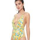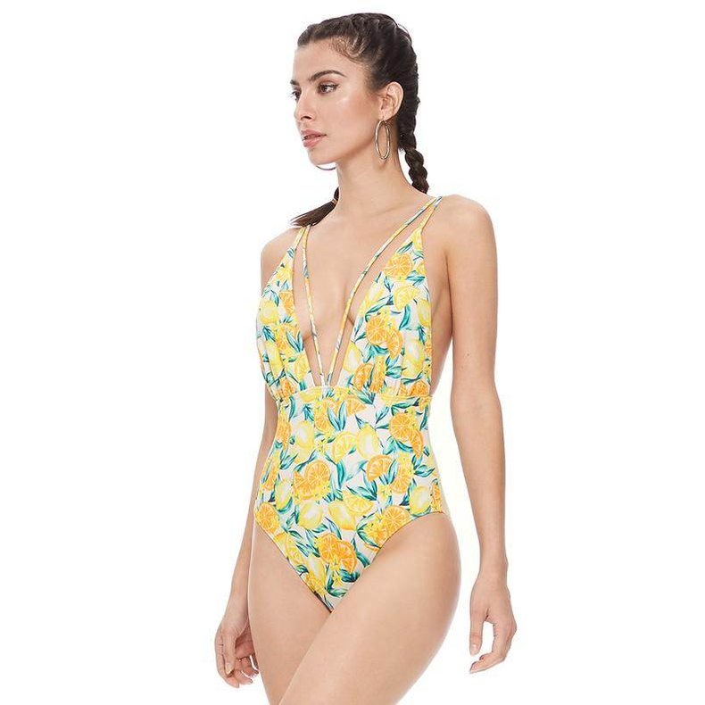 Mesh inserts lemon print plunge one piece style, featuring strappy details in the front, adjustable straps at back, removable paddings, and moderate to cheeky coverage bottom in textured material.