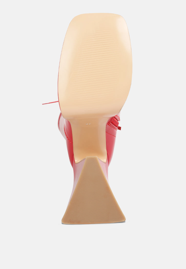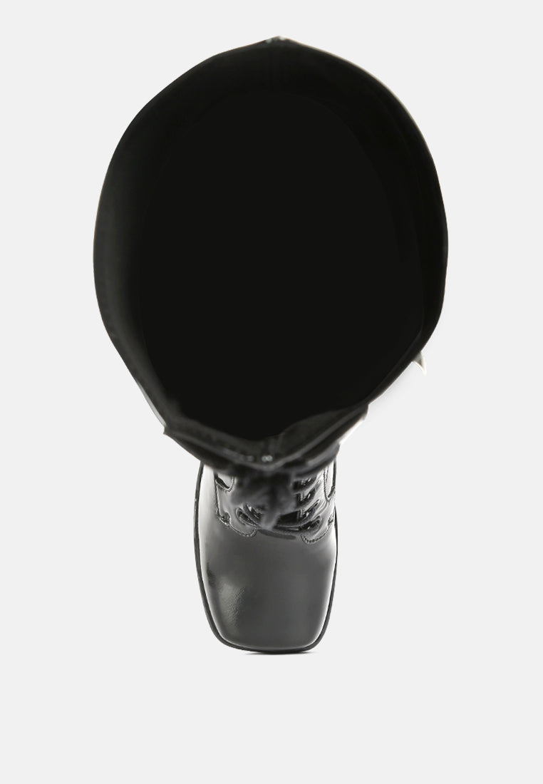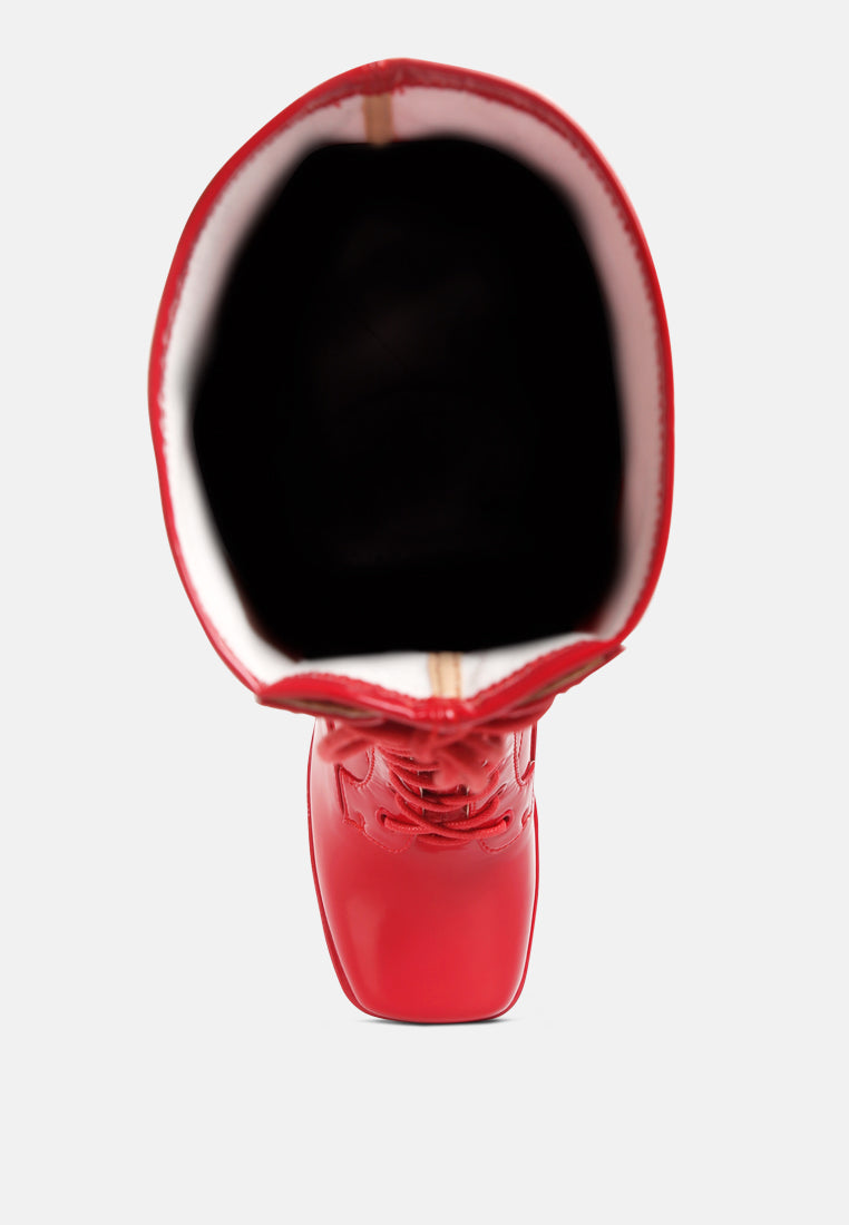 Snowflakes patent PU lace up calf boots are a pair of party stunners. Fit for a crazy clubbing night these high heeled boots are sure to stop the traffic with just one look. They come with a Square toe front and fancy triangle heels with platforms that give you height without hurting your feet. The lightly cushioned insole makes you feel as if you are walking on a cloud but with the look of a Greek Goddess.