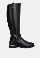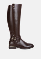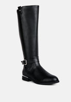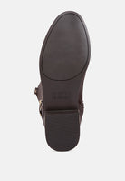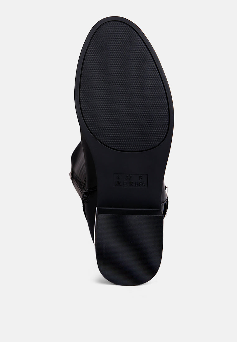 The buckle-embellished boots are edgy and chic with an accentuating gold sling detail on the heel, accentuating the heeled boots' aesthetics. The boots are sure to make a bold statement and are comfortable to wear with soft padded insoles.