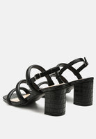 Croc skin faux leather block heel sandals showcase a bold and exotic appeal. The textured pattern adds a touch of intrigue to these sandals, making them a stylish choice for those who want to stand out with confidence and flair.