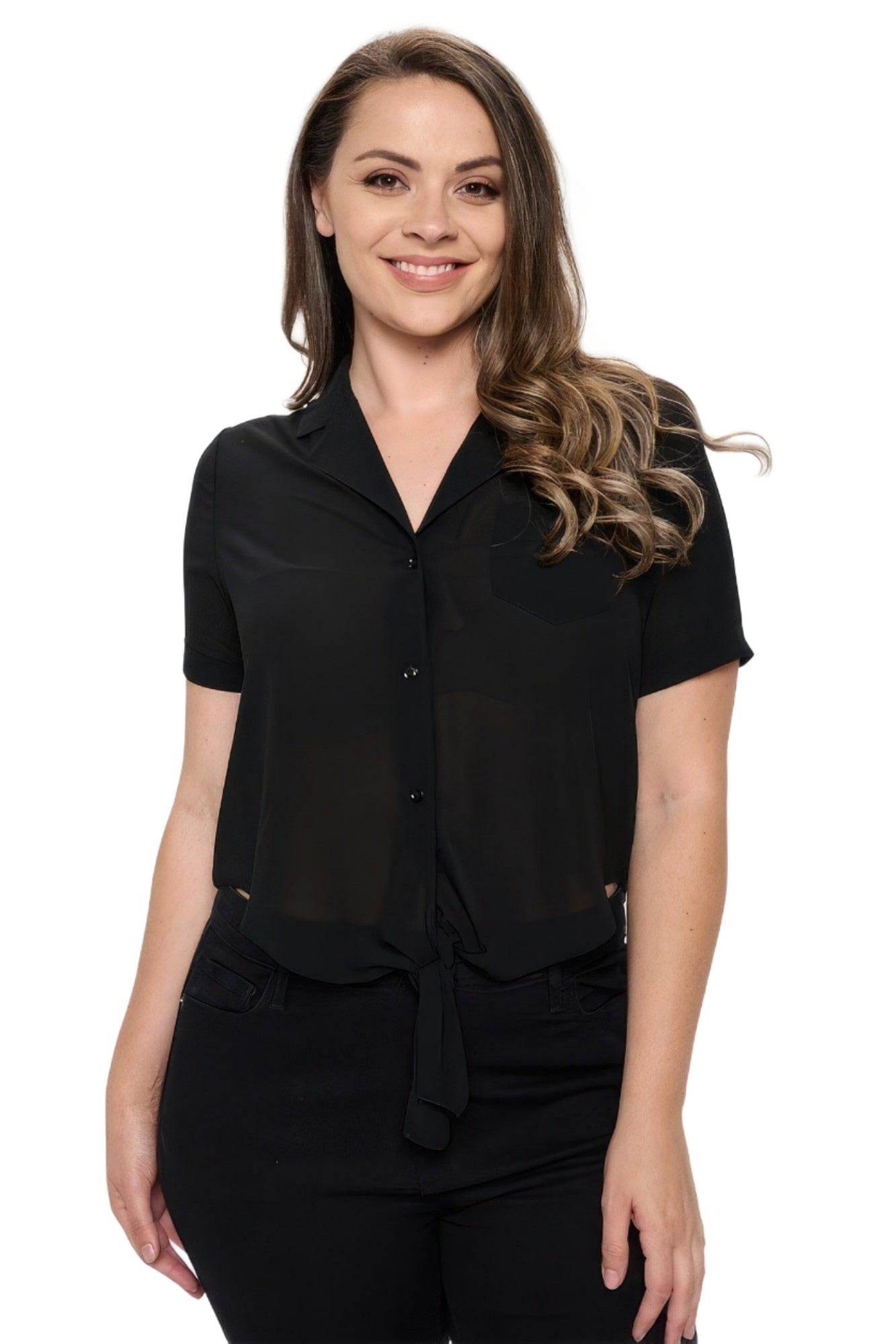 Elevate your plus-size fashion with our Black Plus Solid Chiffon Button Down Tie Front Short Sleeve Top. Add it to your cart now and experience a new level of style and comfort!