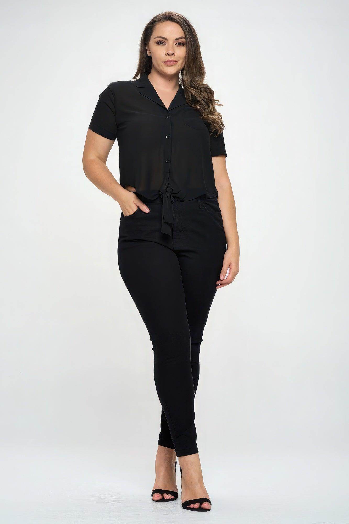 Plus Solid Chiffon Button Down Tie Front Short Sleeve Top Black