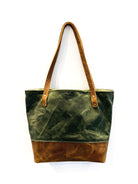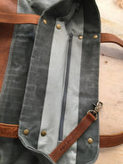 - Waxed canvas exterior, genuine full-grain leather base and straps, cotton lining