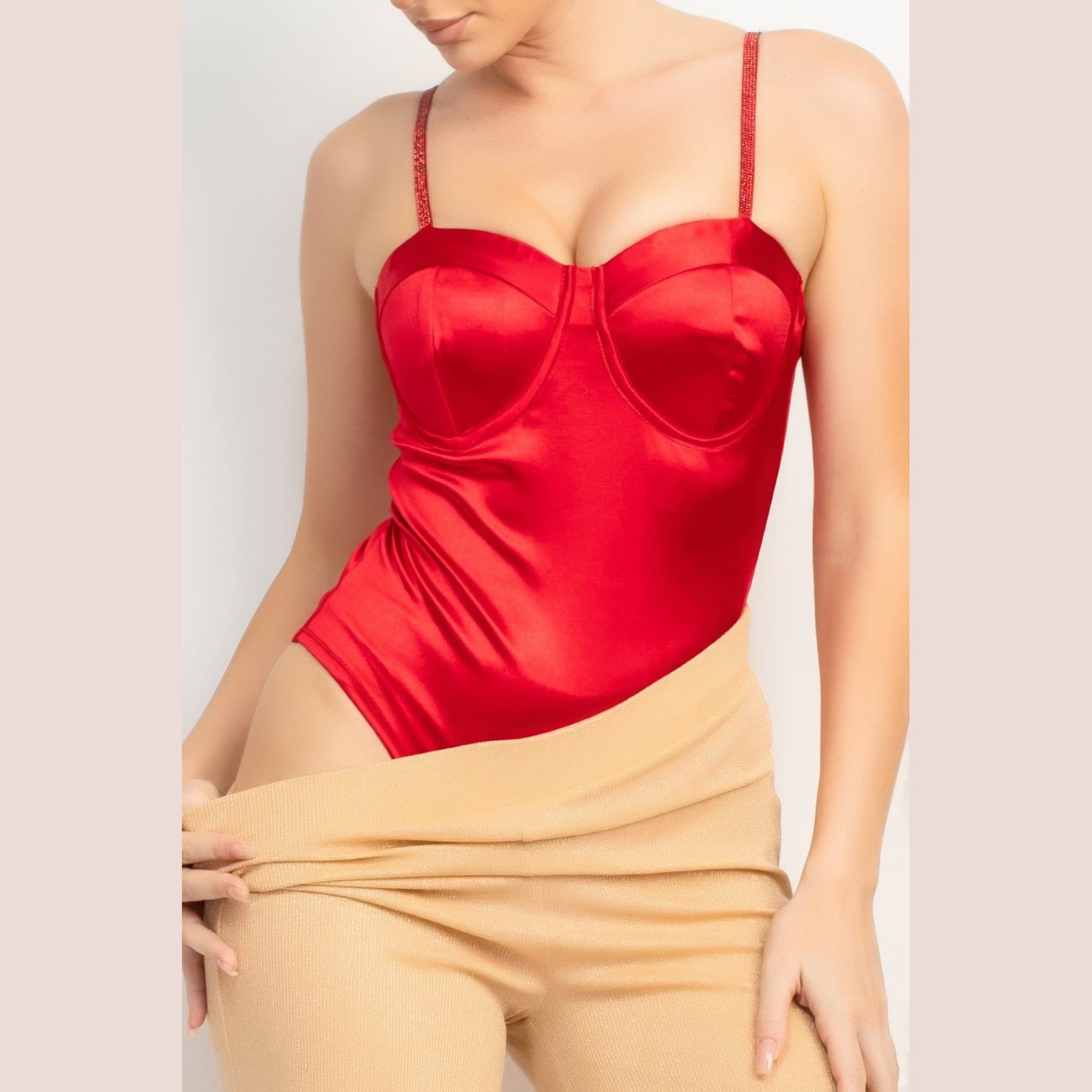Elevate your wardrobe with our Rhinestone Strap Sweetheart Bodysuit in vibrant red. Shop now in sizes S, M, and L and experience elegance and glamour like never before!