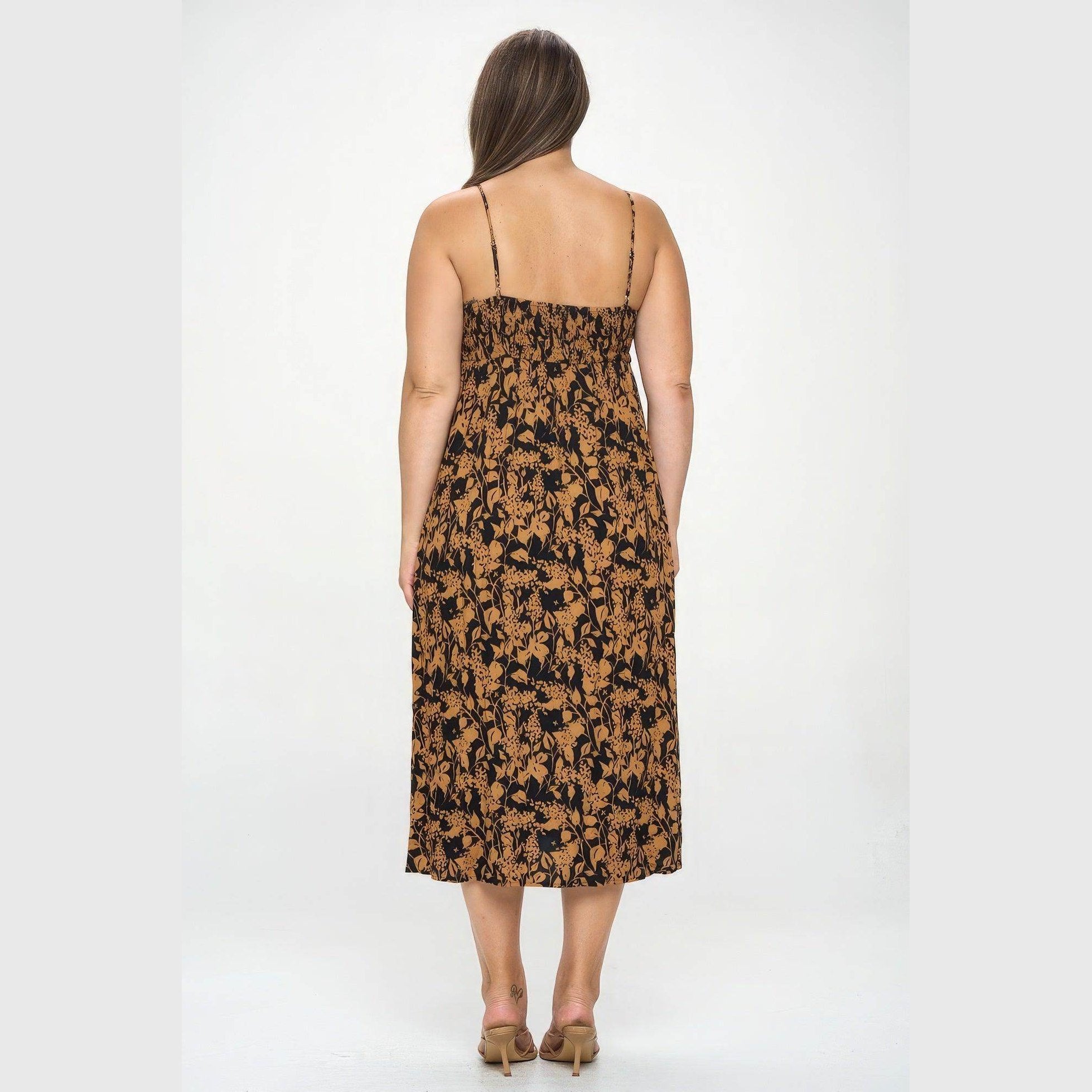 Make a statement with our Brown/Black Plus Botanical Print Front Tie Maxi Dress. Add it to your cart now and experience a new level of plus-size fashion!