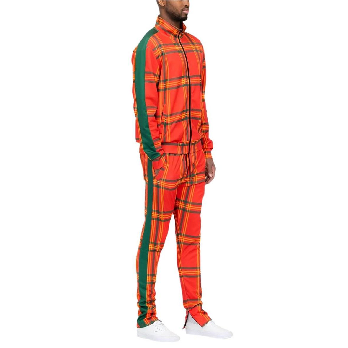 Professionally designed for men, the Orange Plaid Track Jacket and Pant Set offers both style and functionality. Made with breathable fabric, it provides optimal comfort during workouts. Stay fashionable and active with this must-have activewear set.
