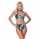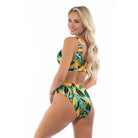 Tropical ribbed stretch-knit bikini top featuring a scoop neck and back, and an elasticized banded hem. A matching stretch-knit bikini bottom featuring a high-rise, a cheeky fit, and high-leg cut. Removable pads and stretch fit.