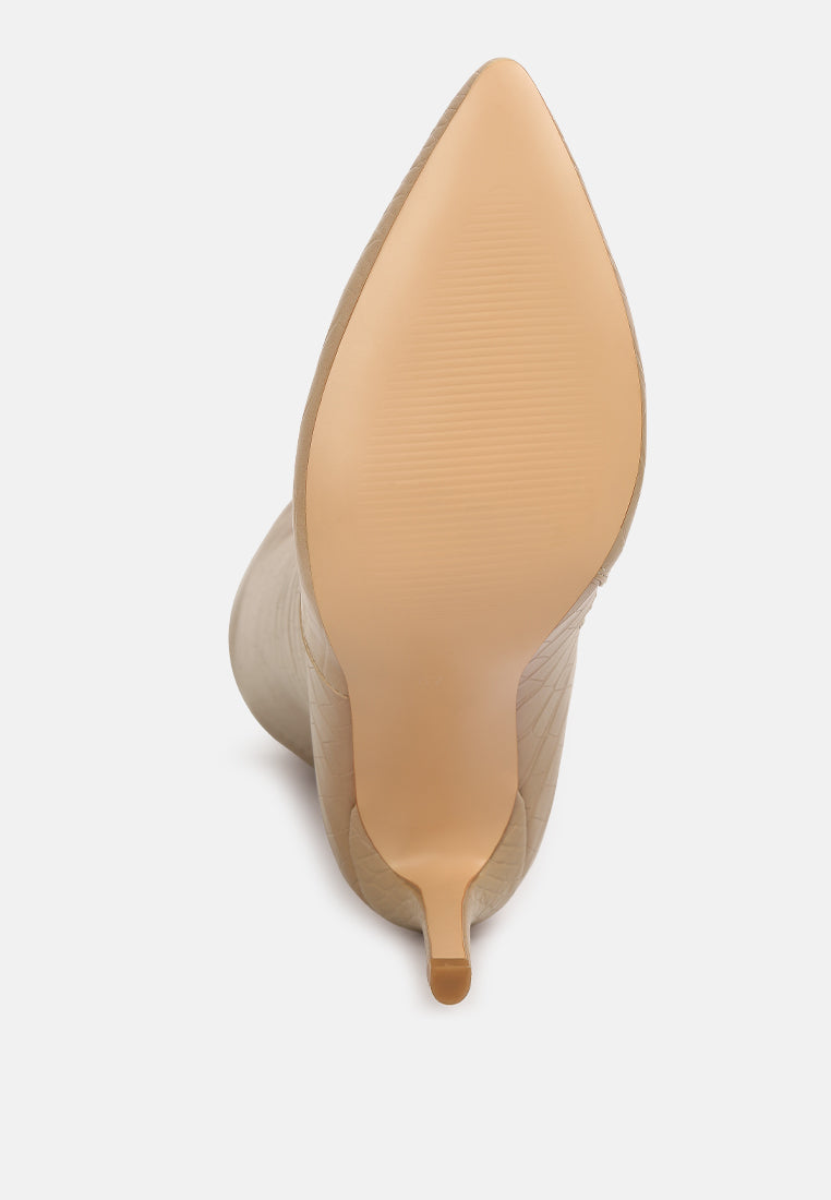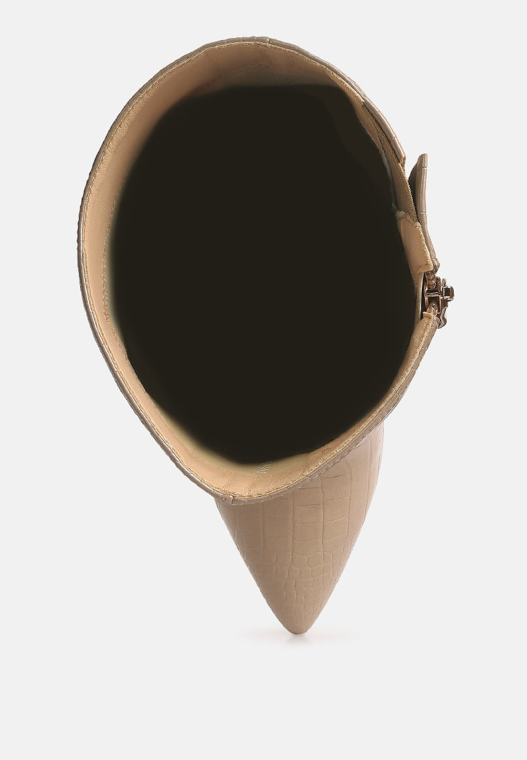 Indulgent High Heel Croc Calf Boots are perfect boots for winter. They have front paneling for optimum comfort and a side zipper for easy access. It gives you the look of a damsel in an old London street just fancying around. The high-heeled boots have a lightly padded insole and a Modern look making you the perfect Diva you are. Available in various colors you never have to think about any outfit mismatch.