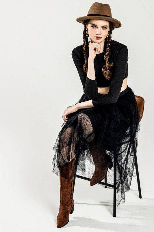 Waterfall PolkaDot Mesh Ruffle Midi Skirt
