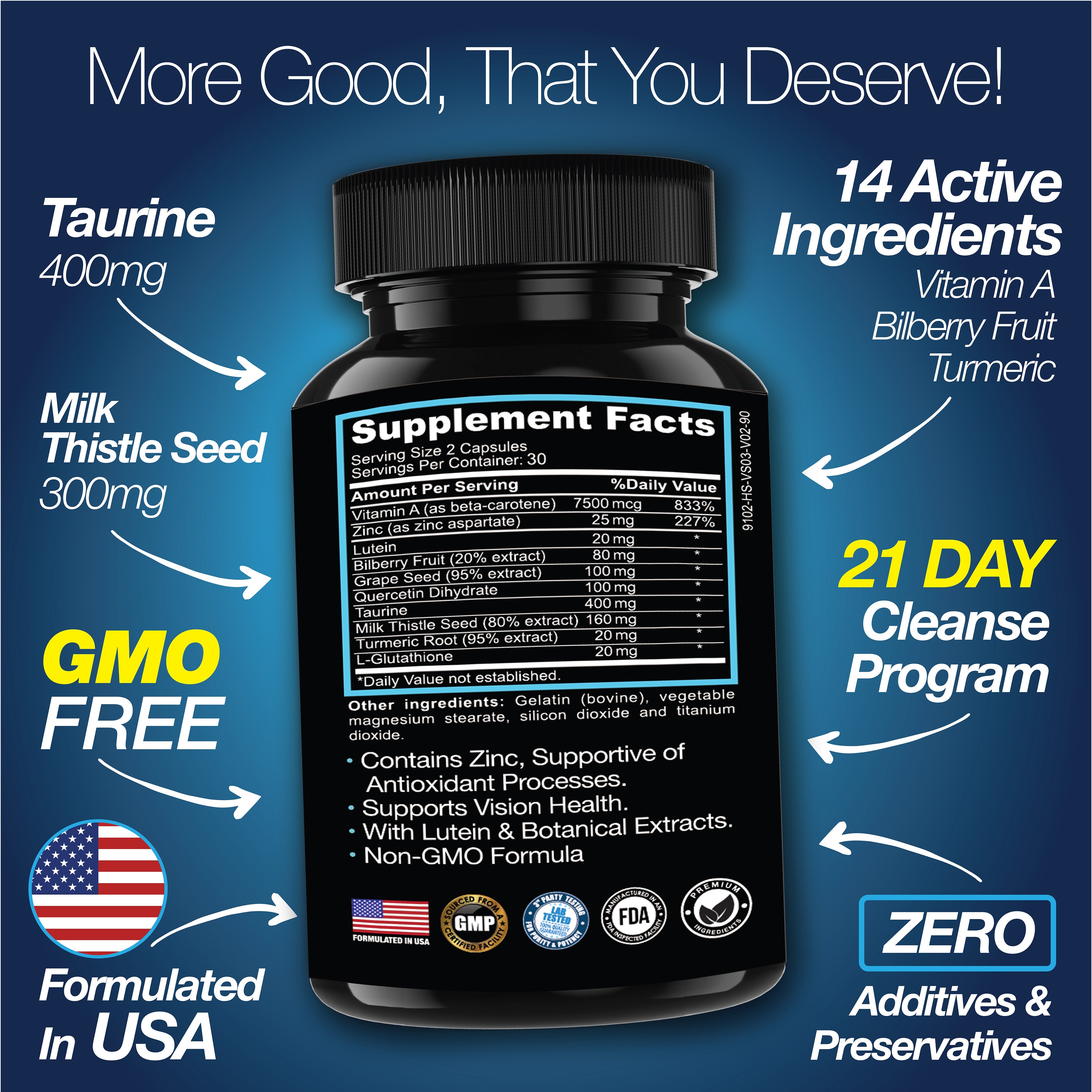 Expertly formulated to provide optimal support for Eye Health, our Supplement features proven ingredients, including Turmeric Root, Milk Thistle, and essential vitamins and minerals such as Vitamin A, Zinc, Lutein, Bilberry Fruit, Grape Seed, Quercetin Dihydrate. Trust in our crafted blend to promote and maintain your vision's well-being.