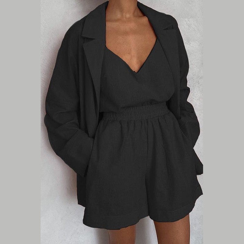 The summer travel matching set brings together effortless style and comfort. The jacket drapes loosely, giving you coverage without overheating. The top has a flattering neckline. The elastic waistband on the shorts ensures a perfect fit, whether you’re lounging by the pool or exploring local markets.