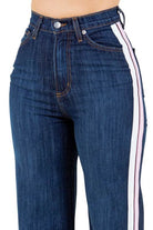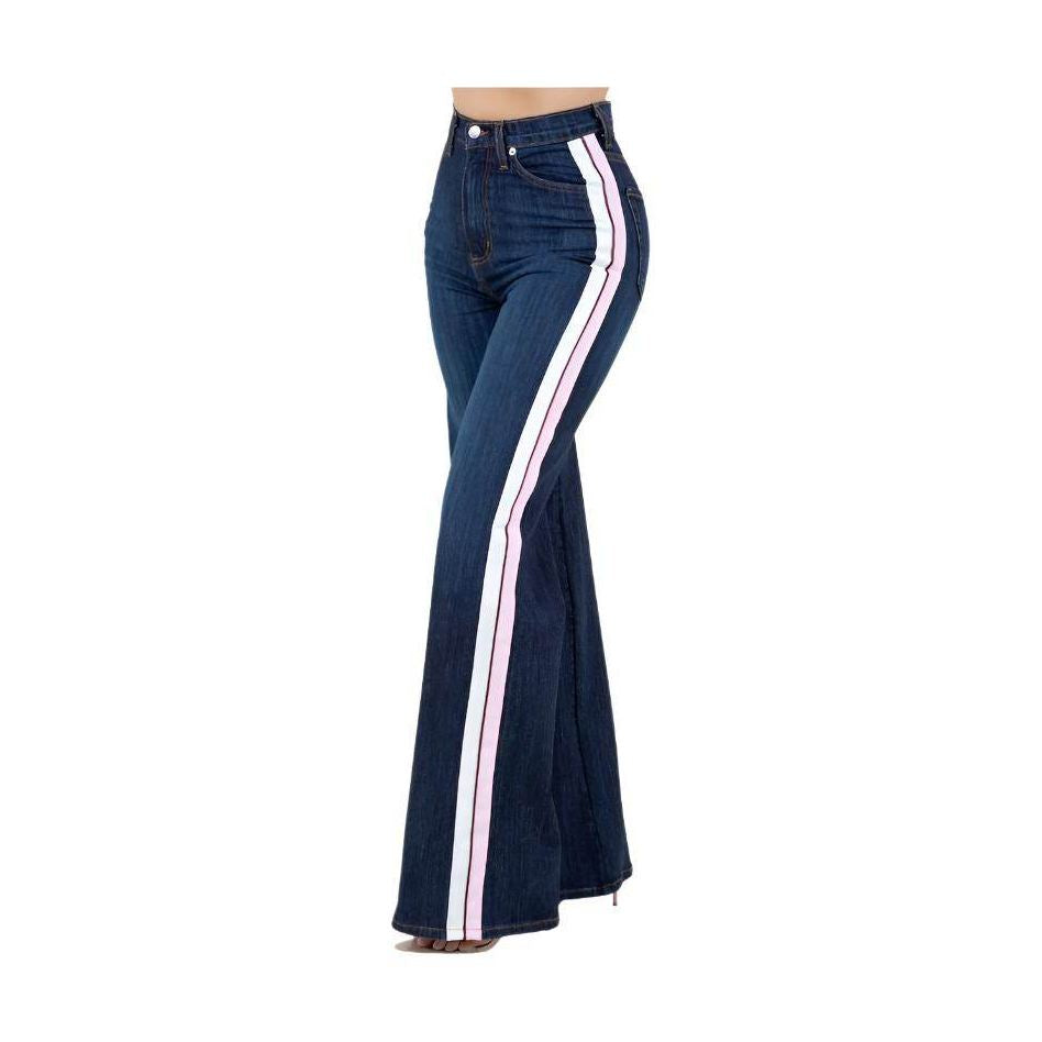 Add a playful touch to your wardrobe with our Striped Wide Leg Pants! Made in the USA, these high rise jeans feature a wide leg fit, front button and zipper closure, and front and back pockets. The Pink and White side stripes add a chic twist to the classic dark wash denim. Stand out from the crowd with this unique and stylish piece!