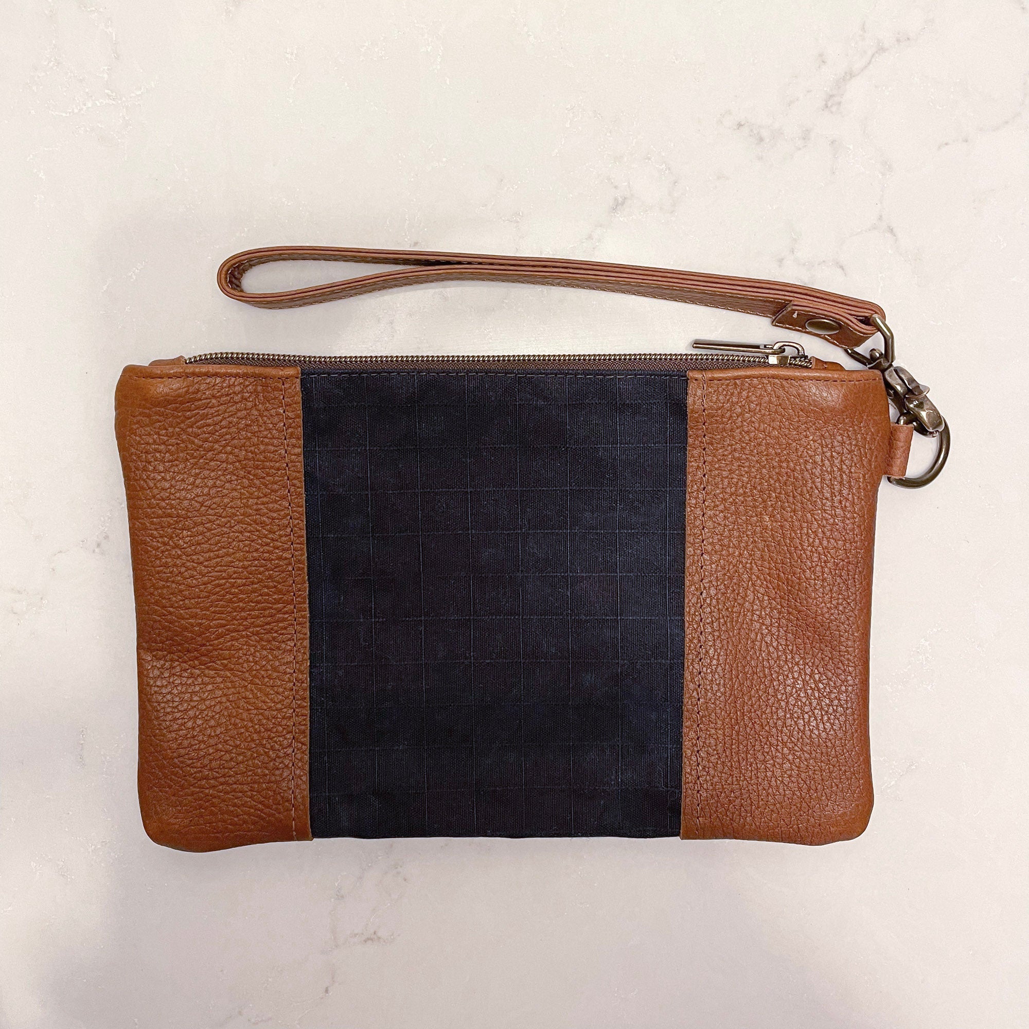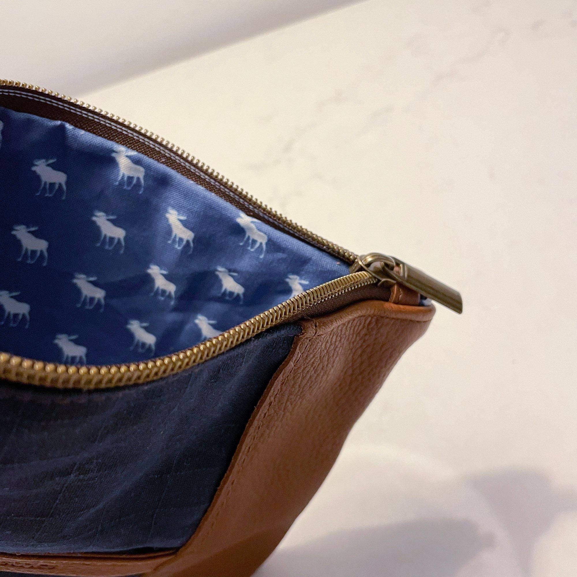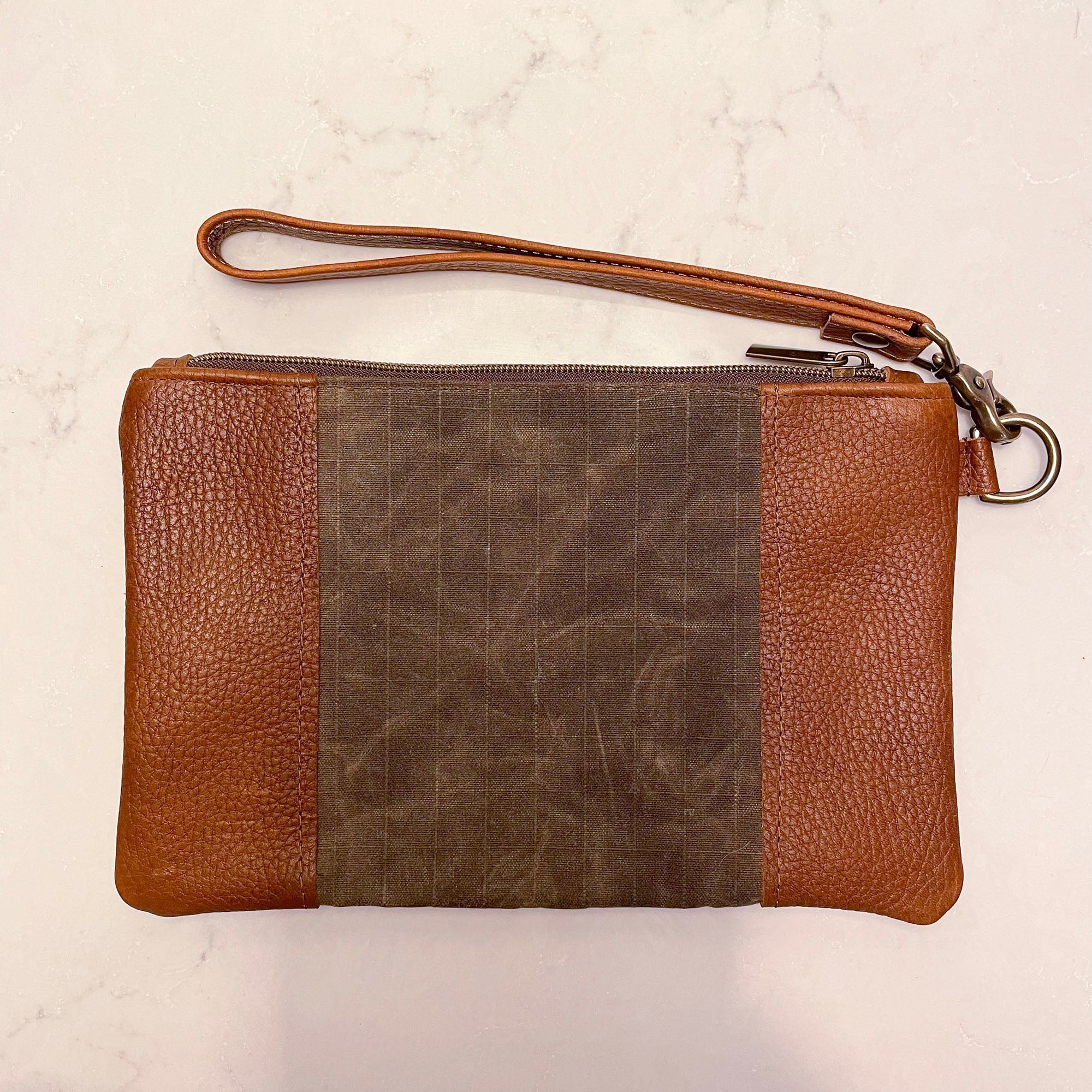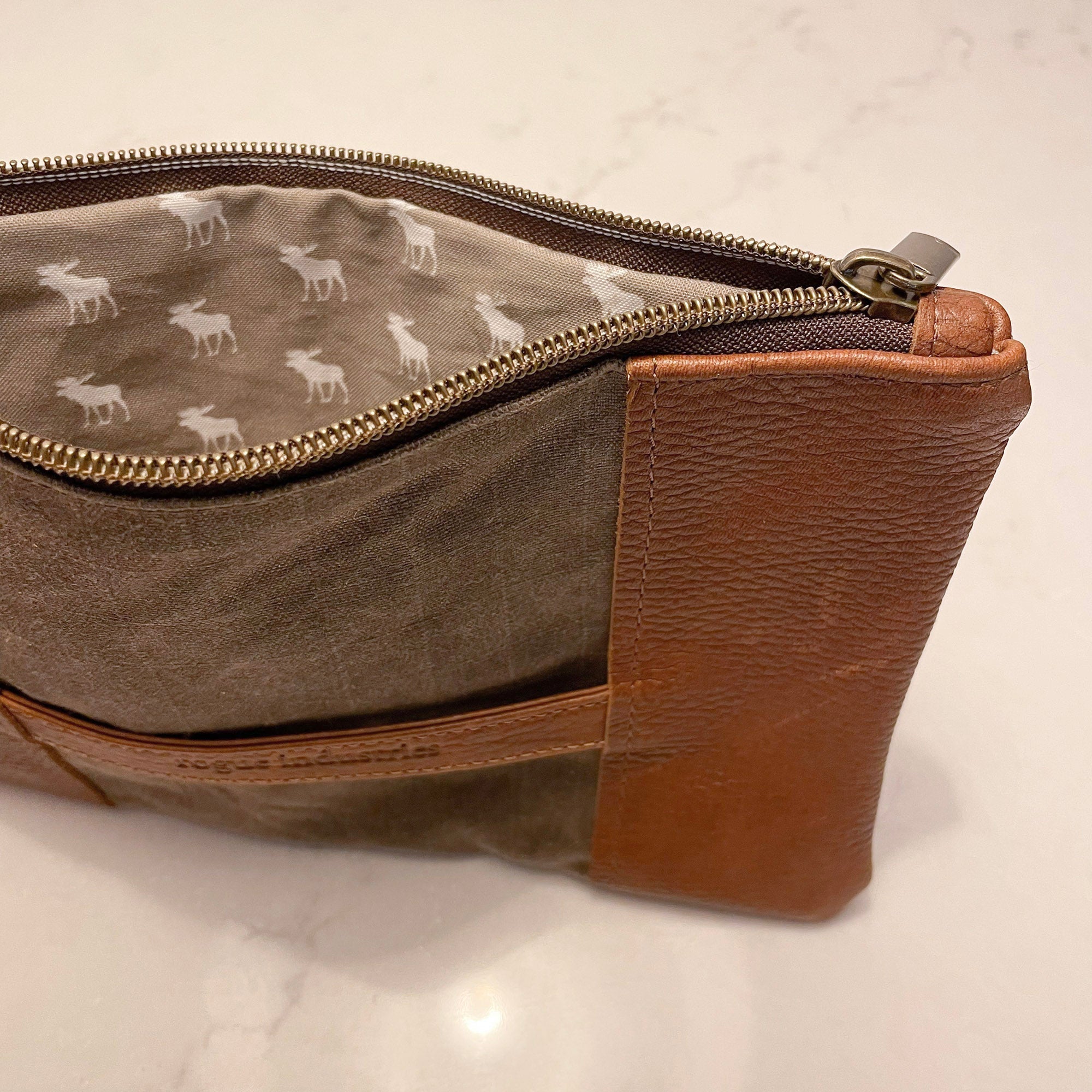 Our leather and waxed canvas Eastport Clutch is stitched at our solar-powered workshop in Maine from lightweight waxed canvas and top-grain leather. Featuring a zipper top and a removable wristlet strap, with a delightful moose print lining.