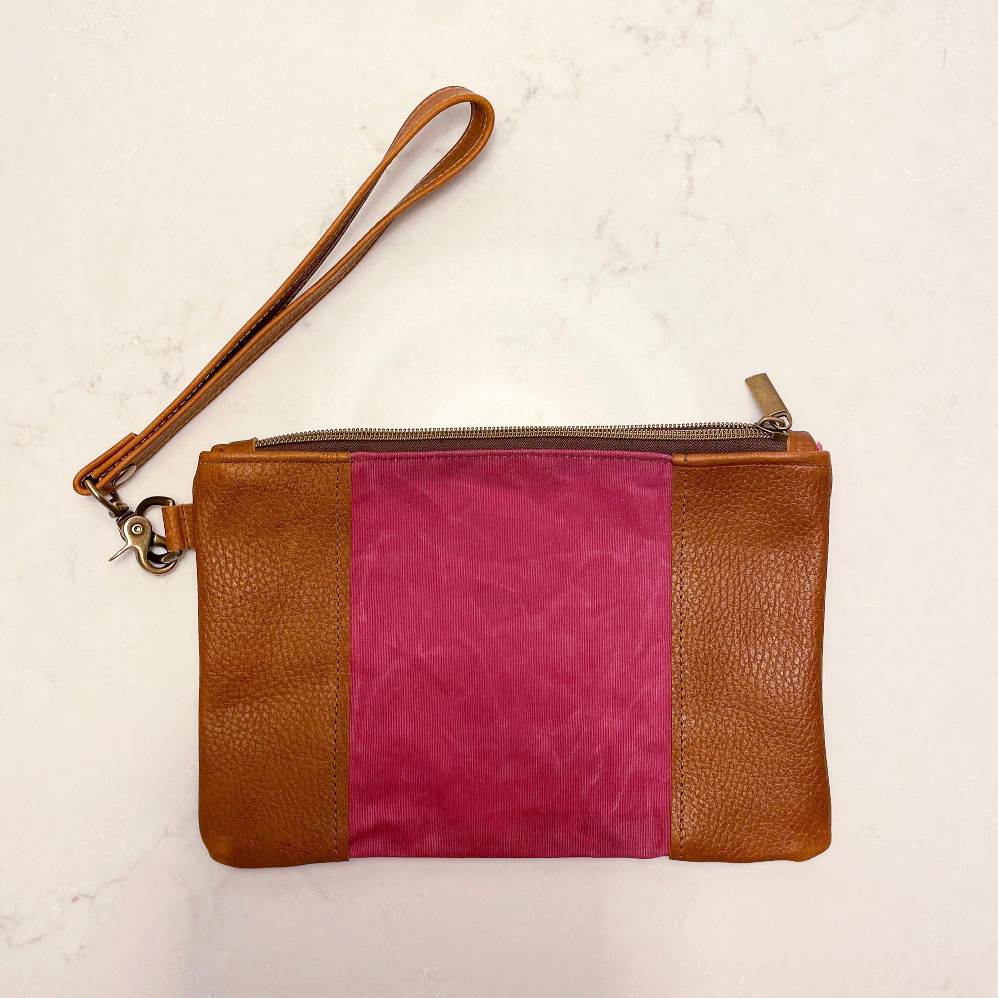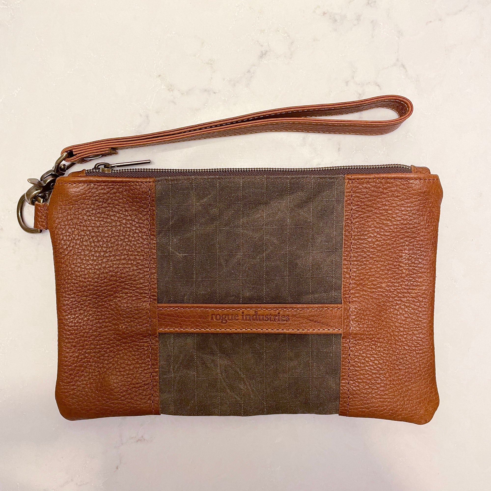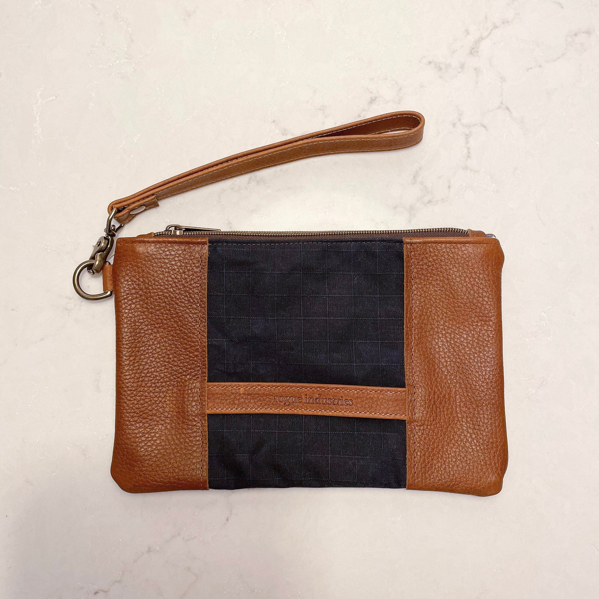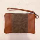 Our leather and waxed canvas Eastport Clutch is stitched at our solar-powered workshop in Maine from lightweight waxed canvas and top-grain leather. Featuring a zipper top and a removable wristlet strap, with a delightful moose print lining.