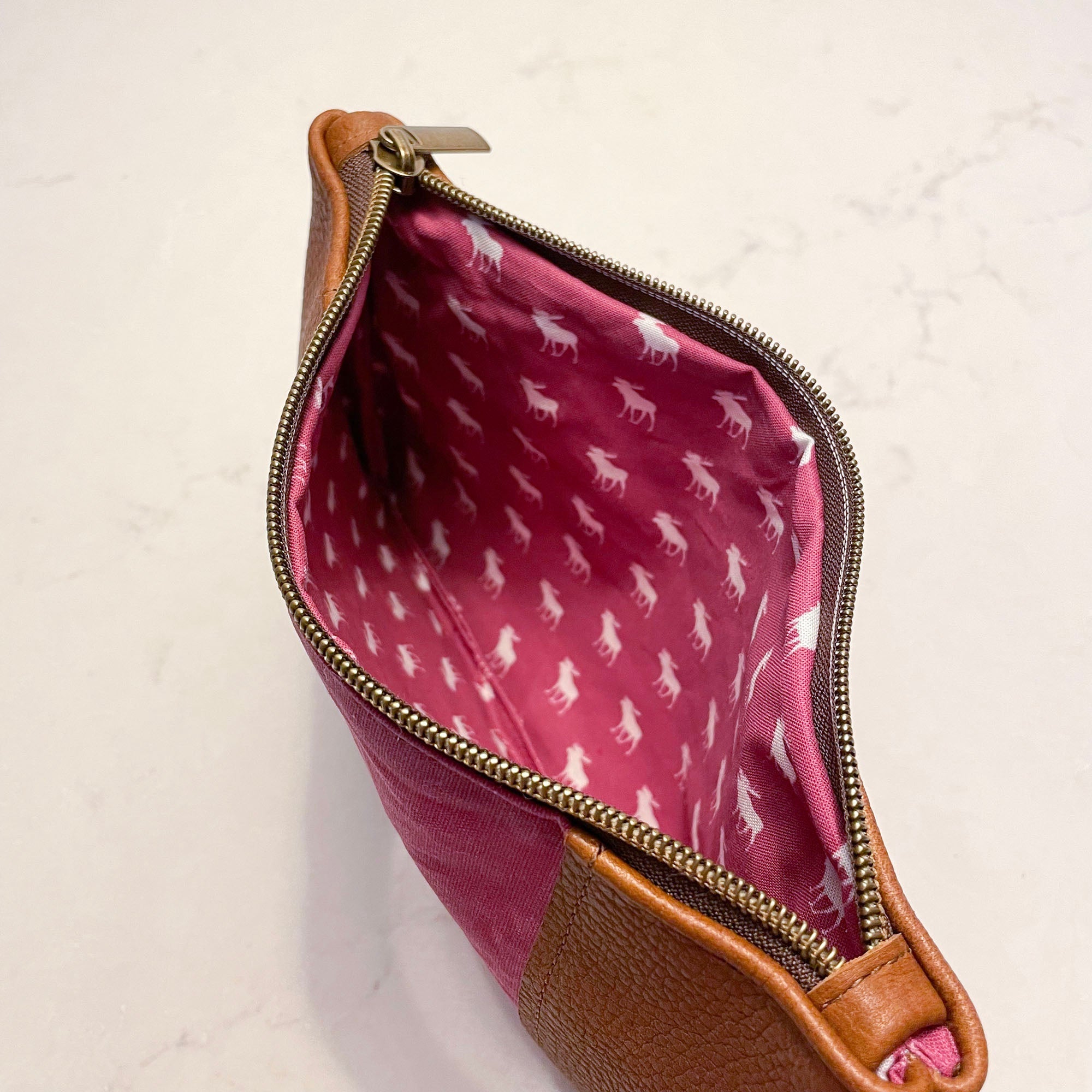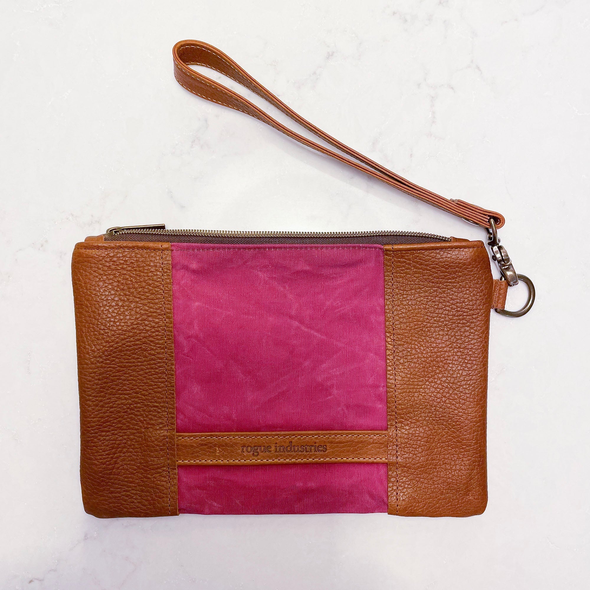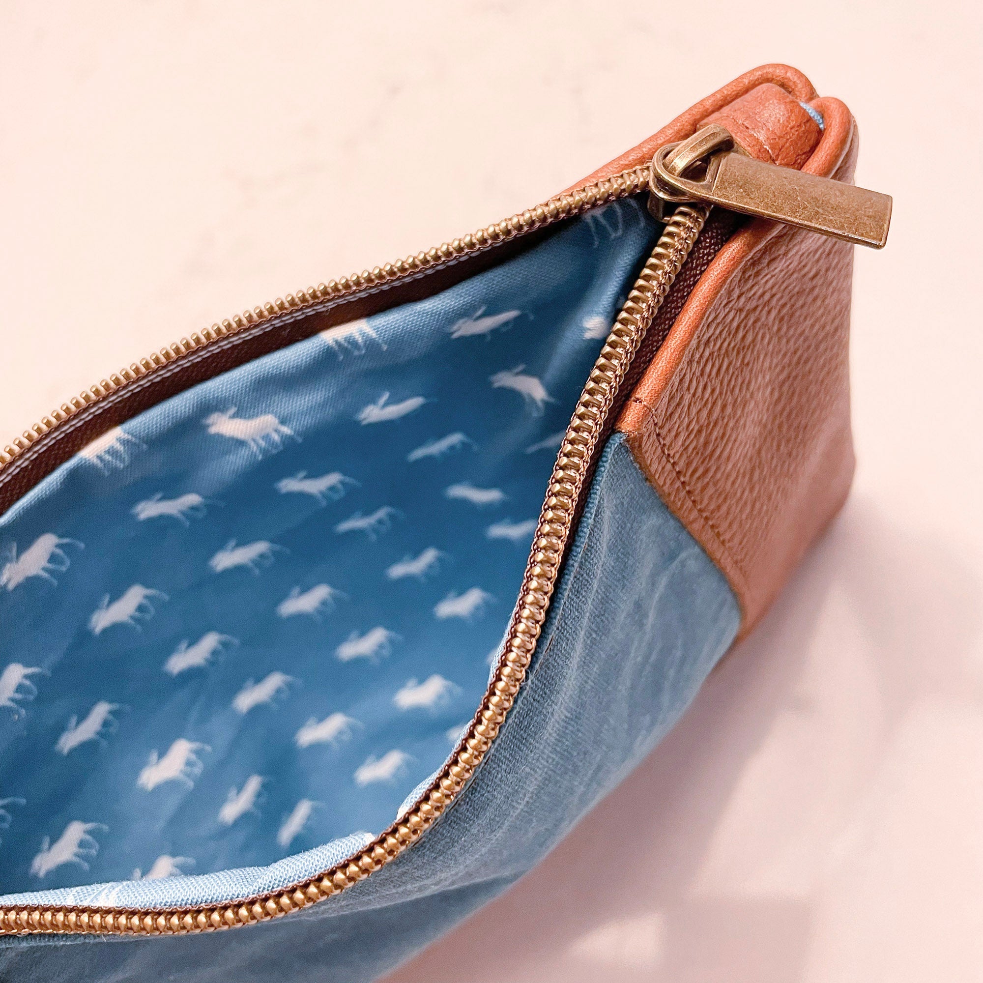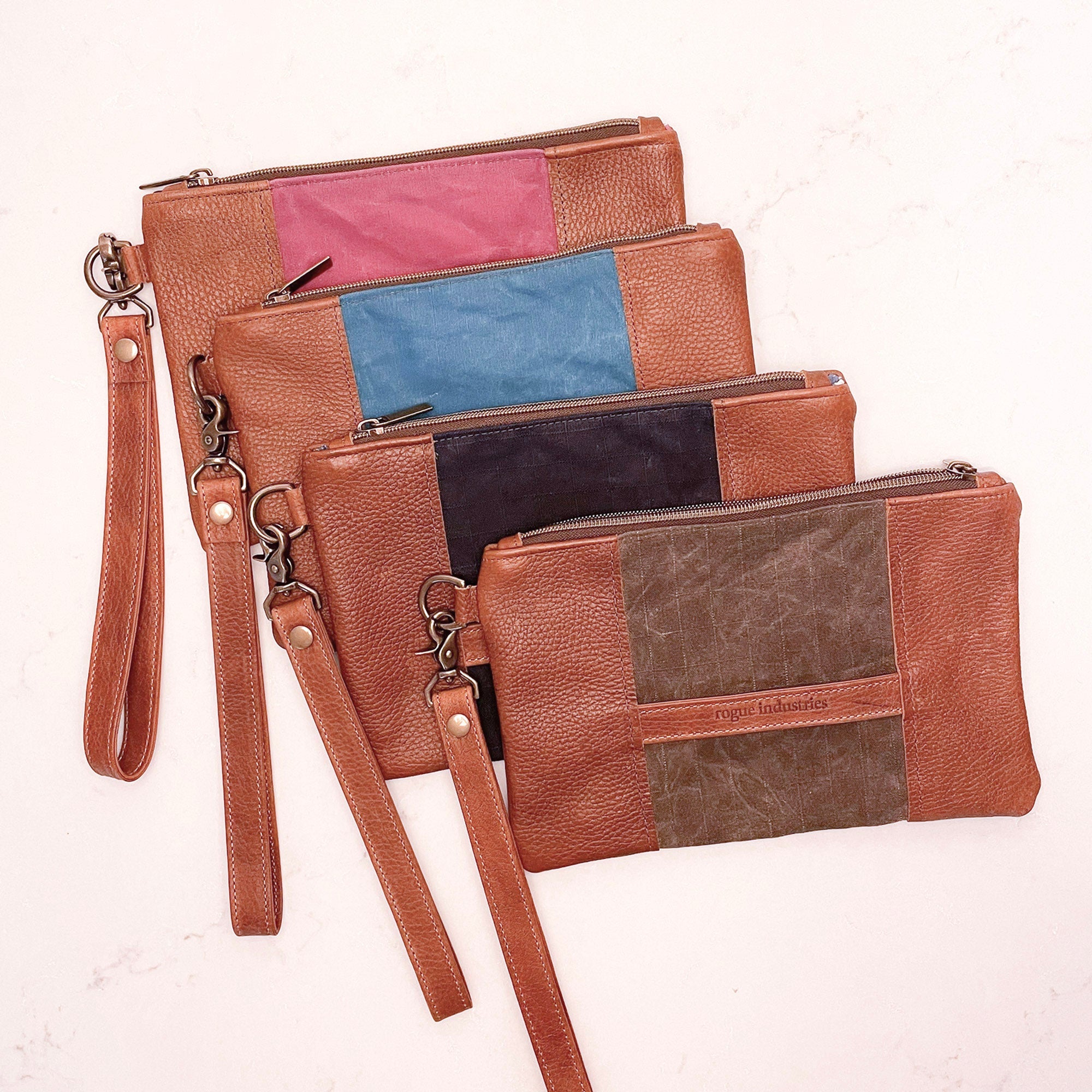 Our leather and waxed canvas Eastport Clutch is stitched at our solar-powered workshop in Maine from lightweight waxed canvas and top-grain leather. Featuring a zipper top and a removable wristlet strap, with a delightful moose print lining.