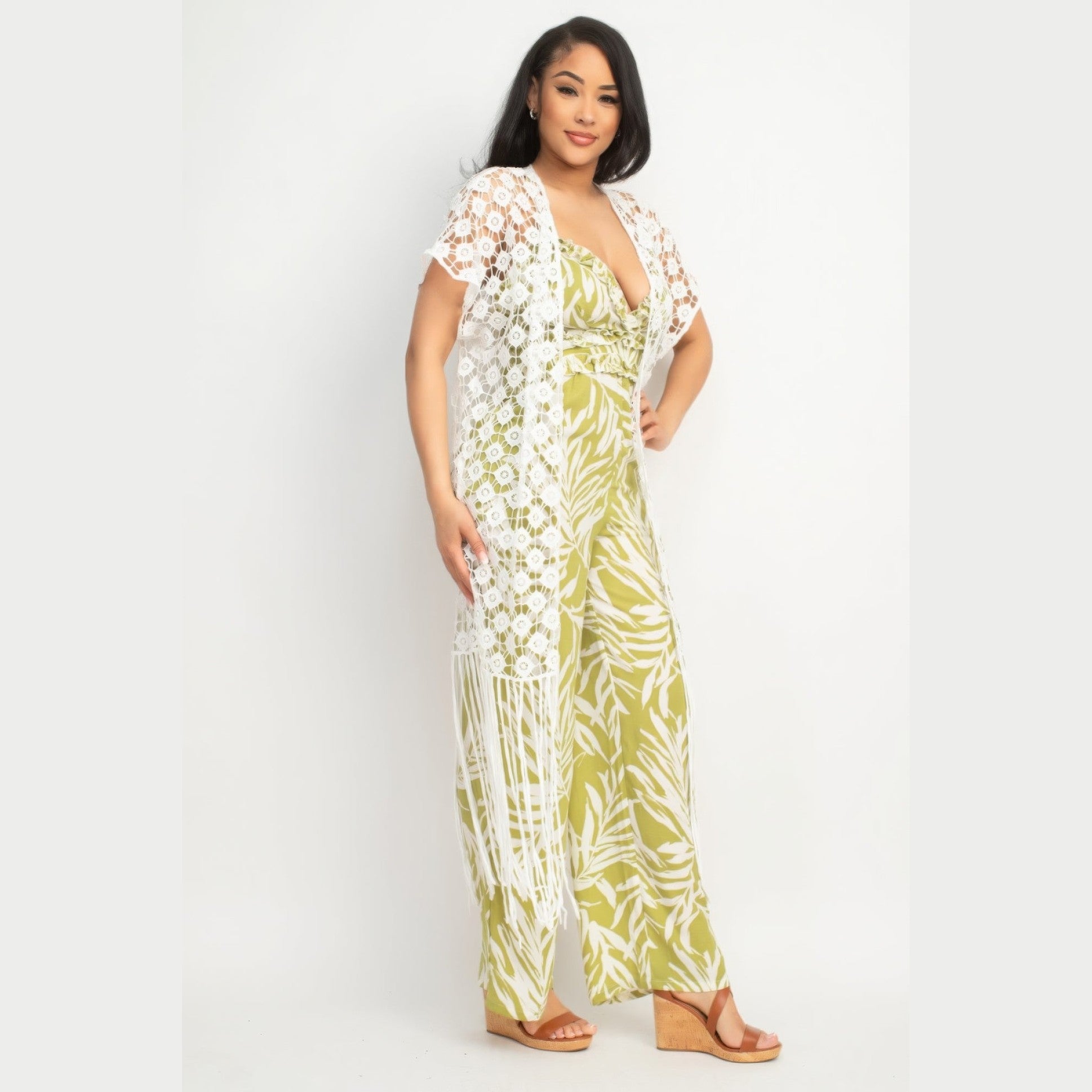 - Statement Piece: The fringe hem and intricate crocheted design make this kimono a standout piece.