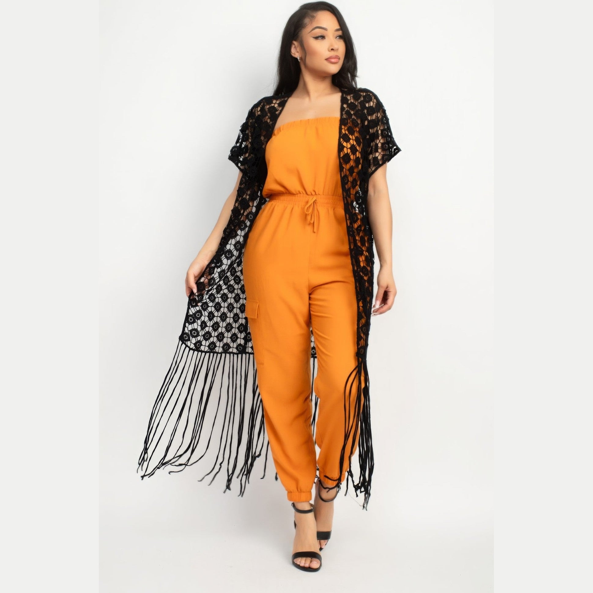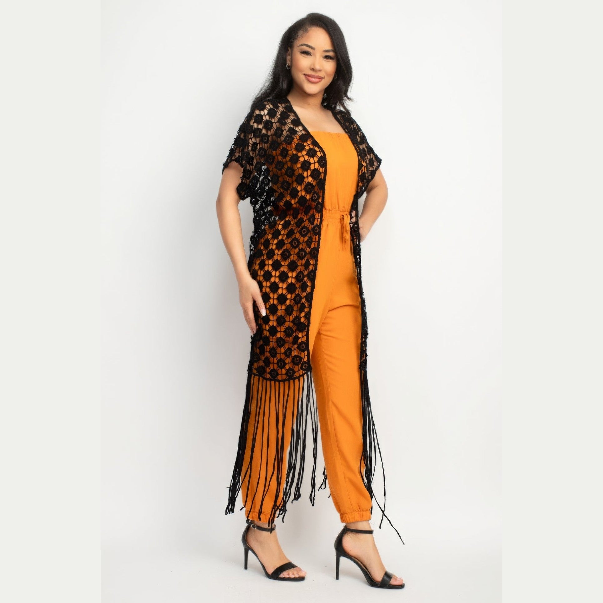 Elevate your style with our Crocheted Open-Front Fringe Kimono in classic black. Shop now in sizes S/M and M/L and embrace bohemian chic effortlessly!