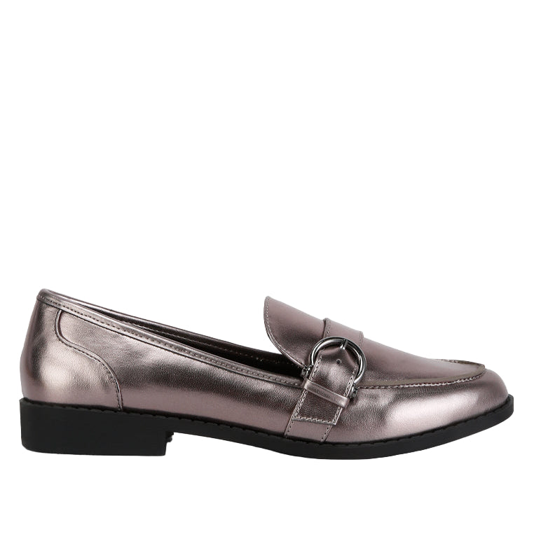 Chic loafers that seamlessly combine style and comfort; featuring a low heel, for comfort and the shine of the metallic faux leather makes them a subtle and striking choice for eveningwear. With the pin buckle detail, and mock stitch accents it becomes a ravishing addition to your wardrobe.