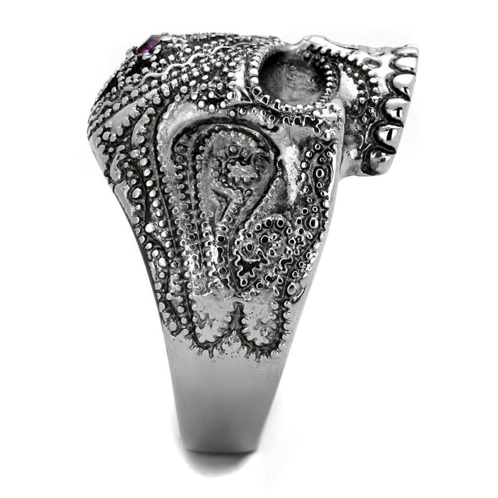 The amethyst gem adds a pop of color, making it a standout piece in any jewelry collection. Stainless steel skull jewelry like this is not just about appearance; it's about making a statement. The unique combination of material and design makes this ring ideal for various occasions, from casual outings to special events.