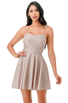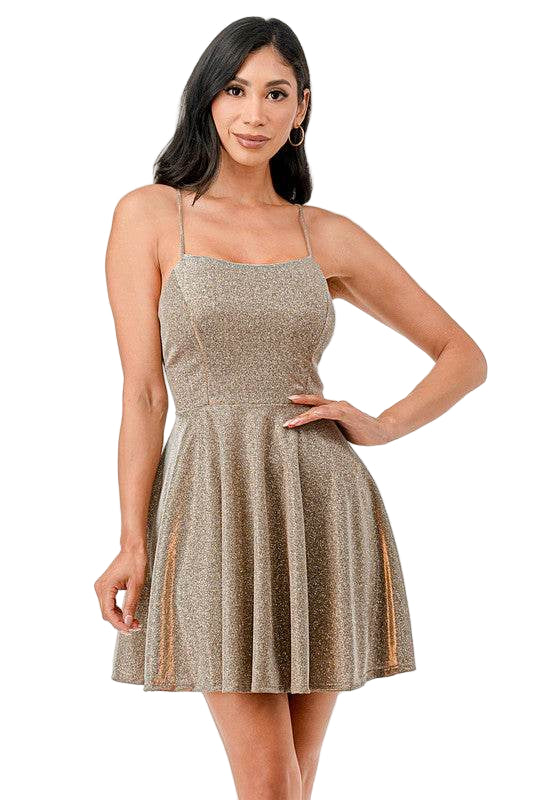 Glittered fit and flare dress with back crisscross spaghetti for prom homecoming cocktail dress