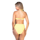Striped bandeau top features front tie detail, removable soft pads, adjustable and removable shoulder straps, and back hook closure. High waist bottom offers waist band detail, moderate coverage. Stretch fabric and fit.