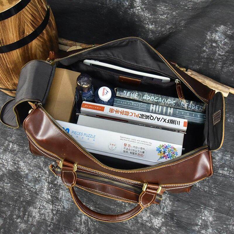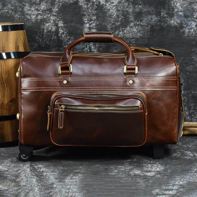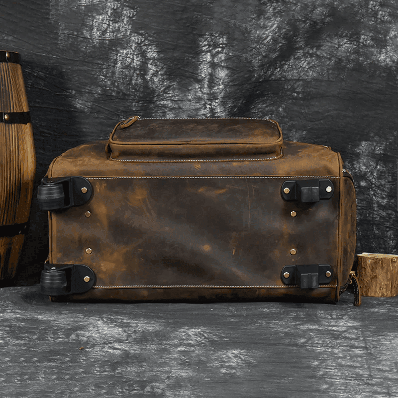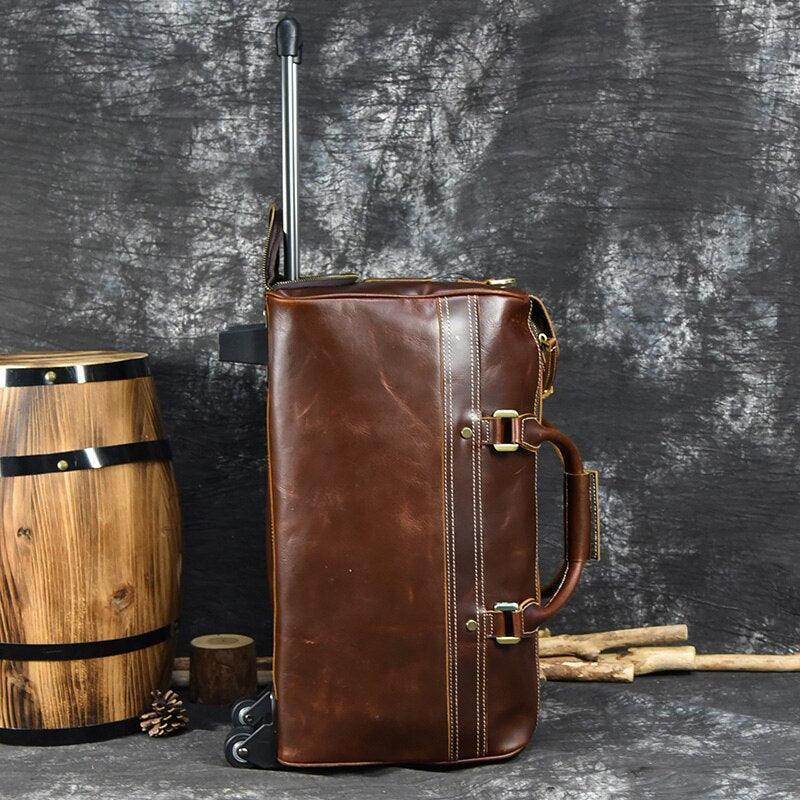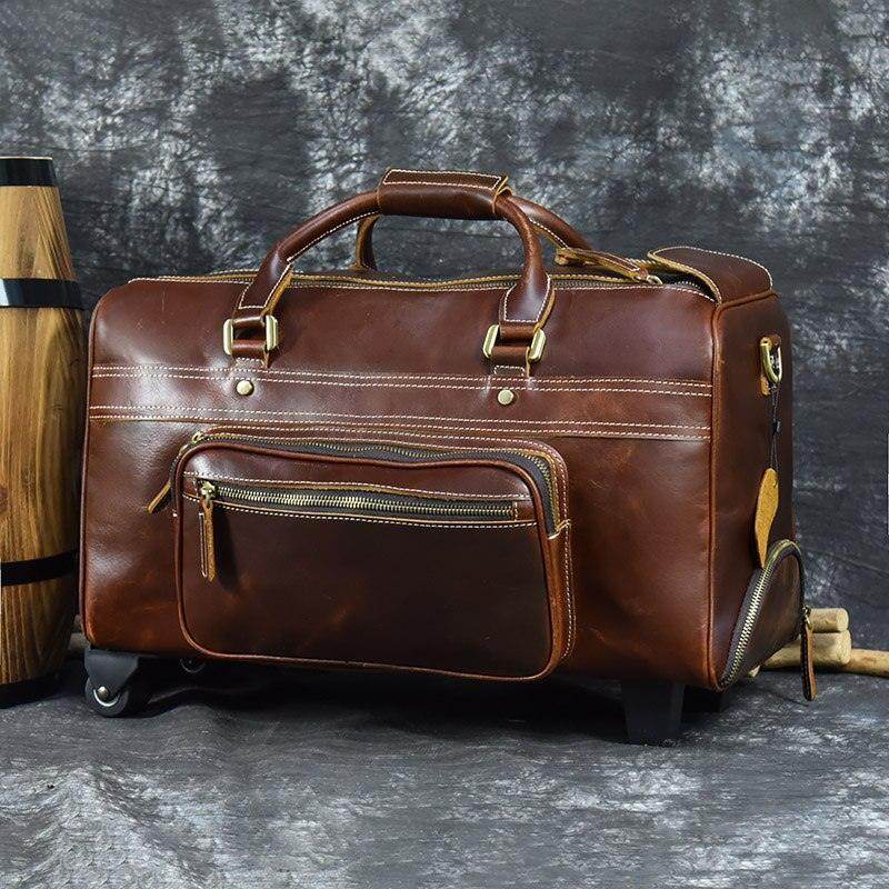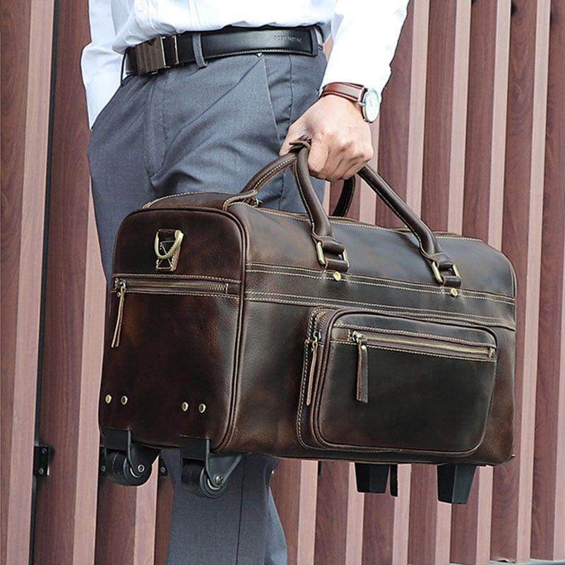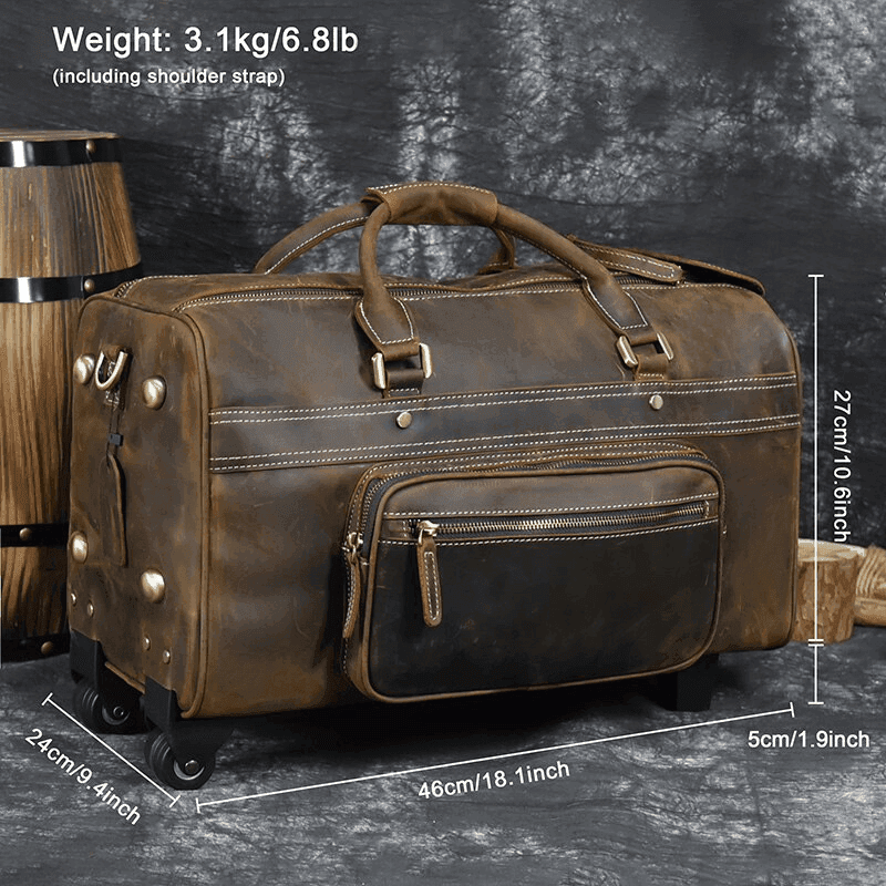 Inside, you'll find spacious compartments that provide ample room for all your essentials. Whether it's a weekend getaway or a business trip, this bag suits every purpose. The premium leather wheeled duffel bag delivers not just convenience but also an unmatched class.