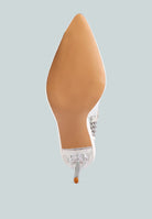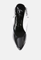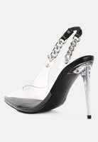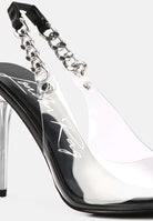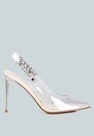 High-heeled clear sandals are a trendy choice, showcasing your skin and keeping the color on your feet to a bare minimum. These sandals feature an elasticated slingback design with metal chain detailing that ensures a secure and comfortable fit.