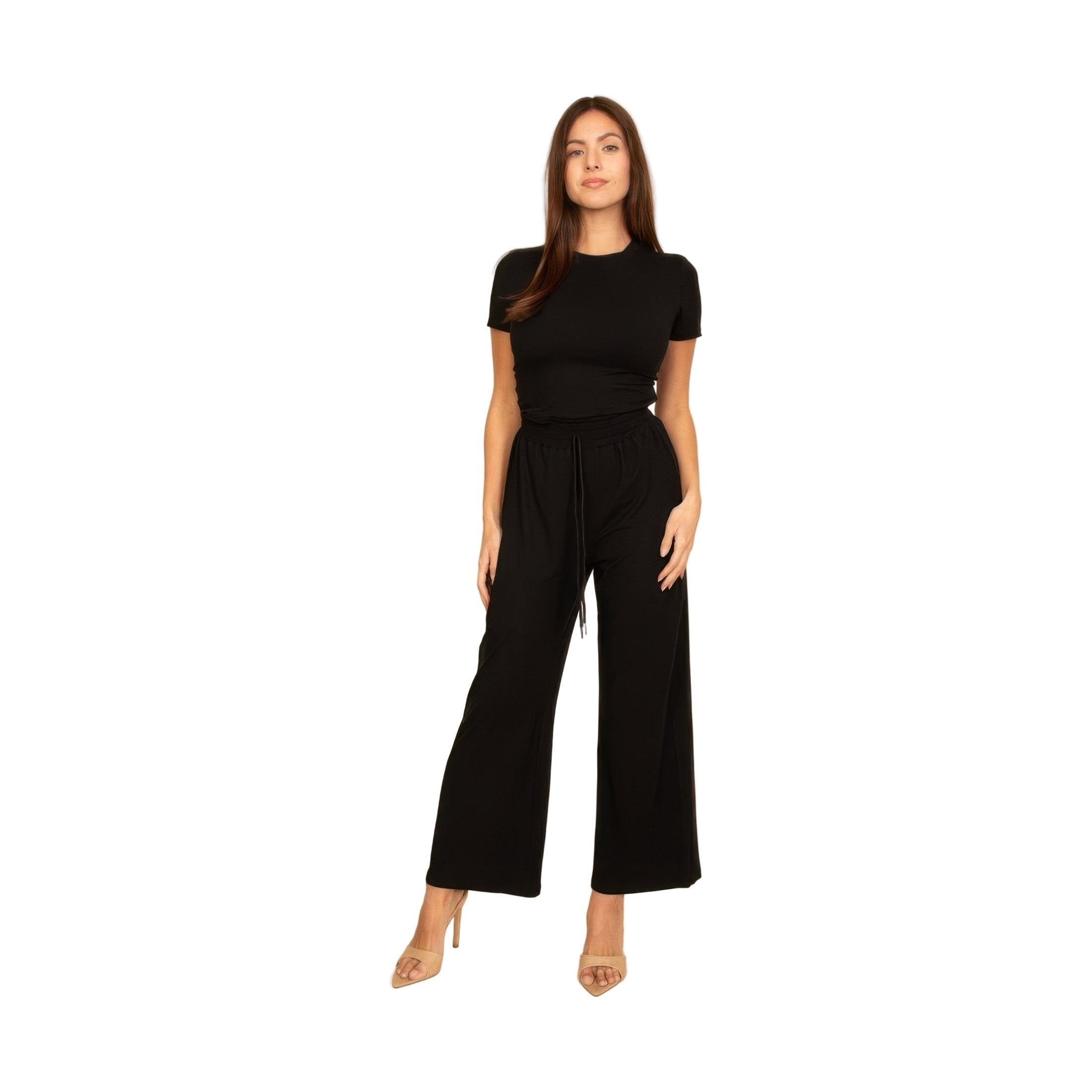 Stay effortlessly polished with this Relaxed Fit Top and Wide-Leg Pants Set. The short-sleeve fitted top pairs seamlessly with flowy, high-waisted pants featuring an elastic waistband and decorative drawstring. Crafted from soft, breathable fabric, this set offers easy comfort with a clean, modern silhouette. Great for lounging, working from home, or stepping out in style.