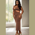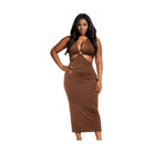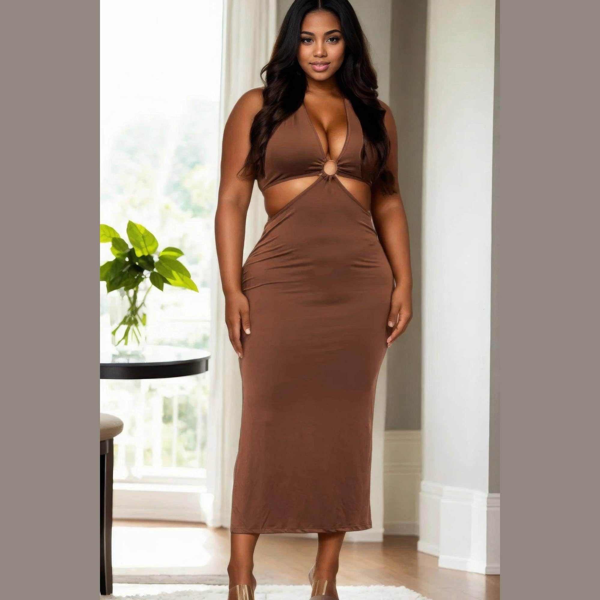 Get ready to turn heads and make a statement with our Plus Size Cut-out Halter Neck Double Back Tie Split Thigh Midi Dress. Add it to your cart now and experience the perfect blend of fashion and comfort!
