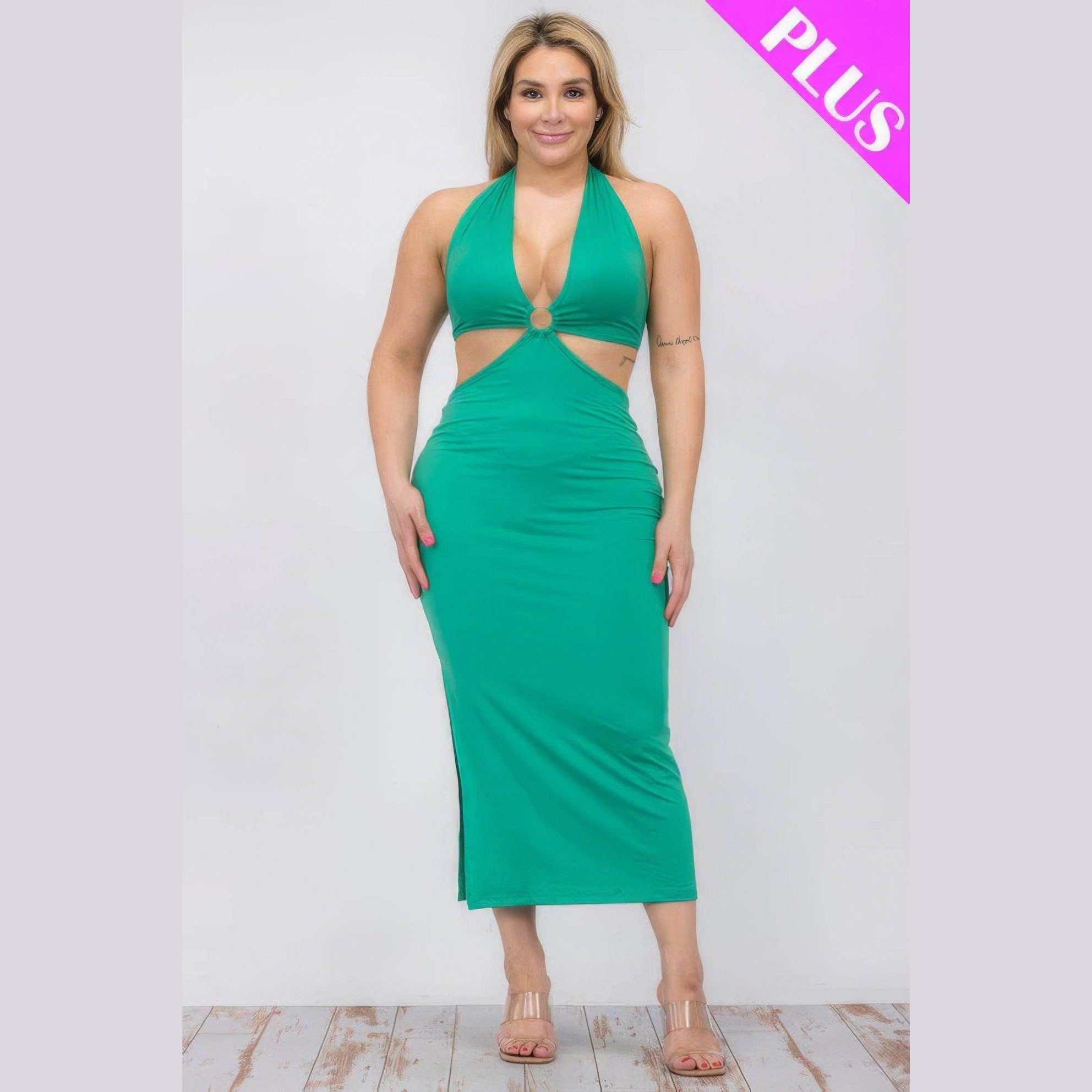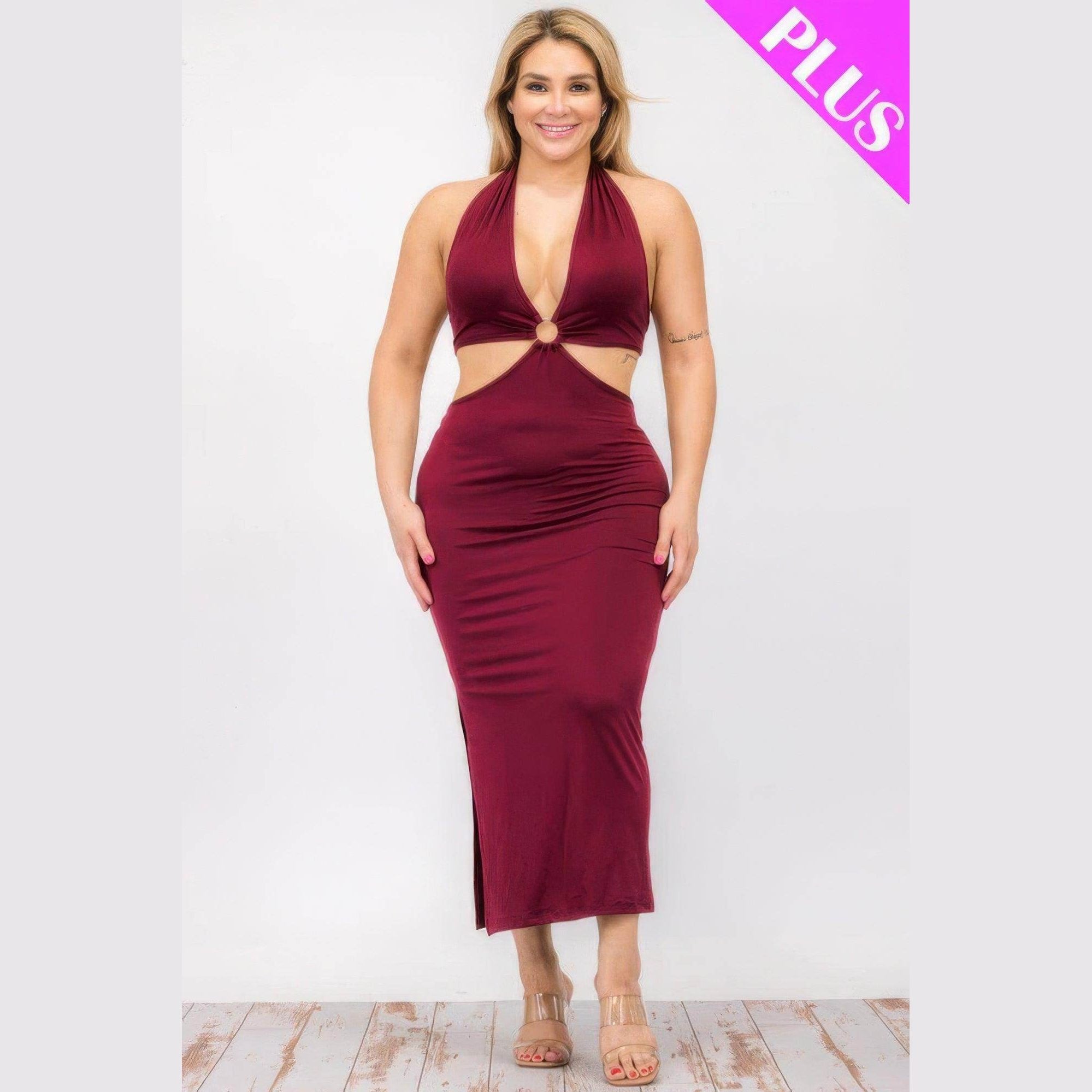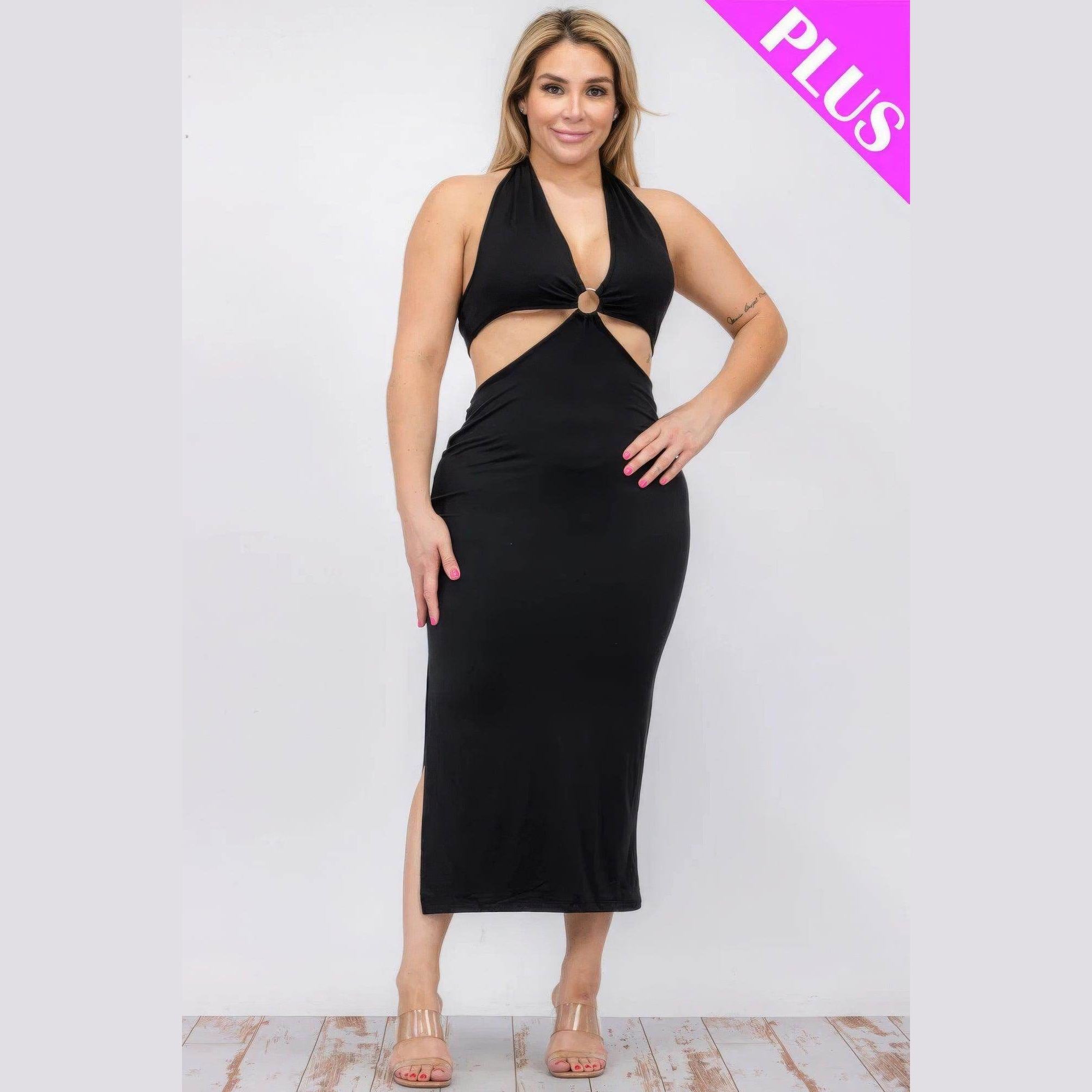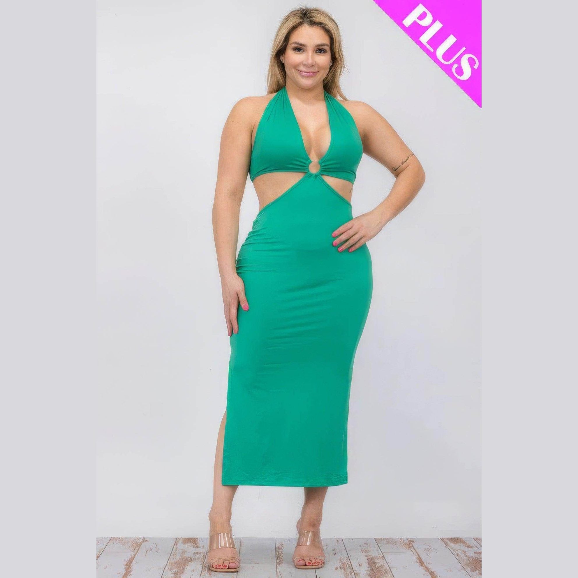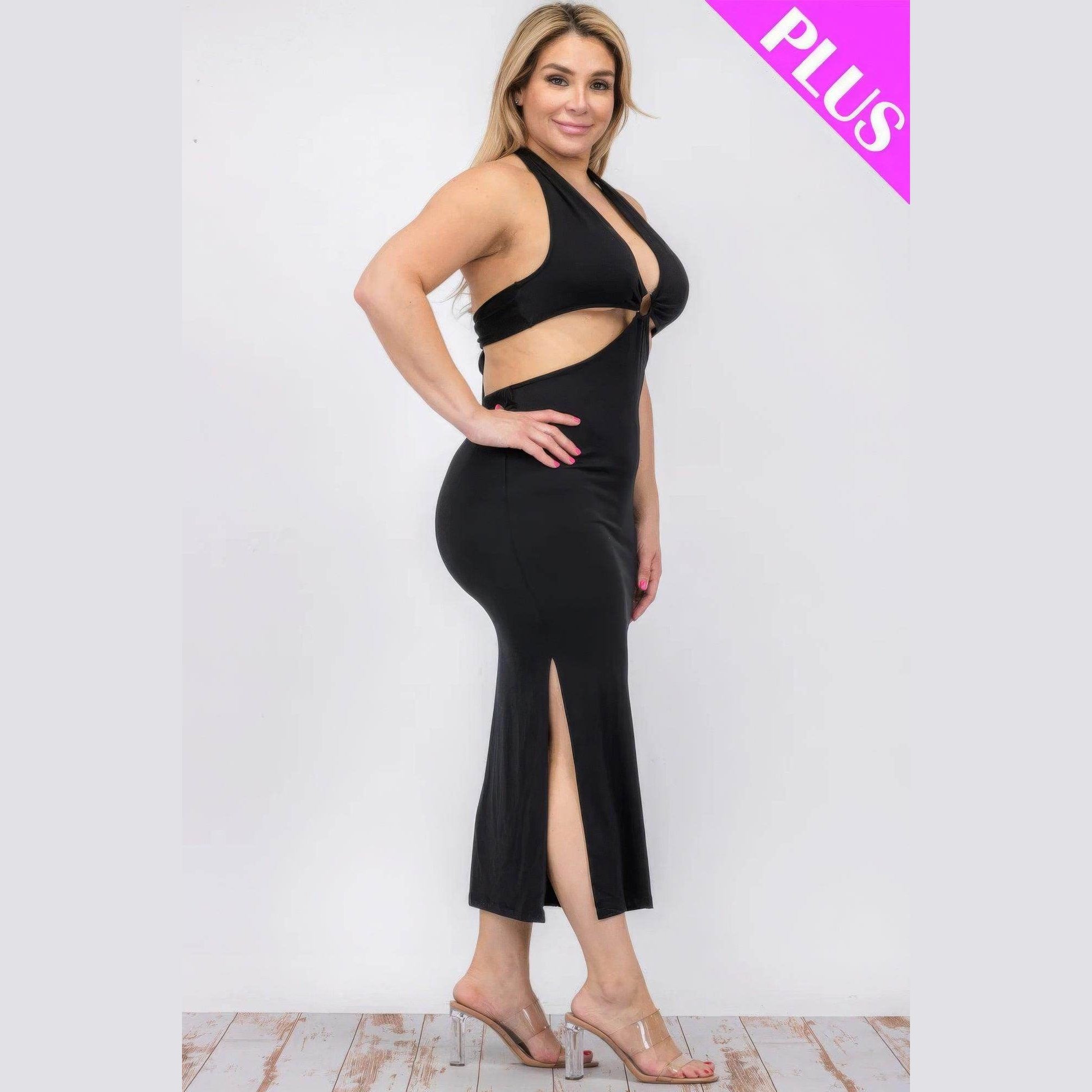 Learn more about our Plus Size Cut-out Halter Neck Back Tie Split Midi Dress at VacationGrabs: